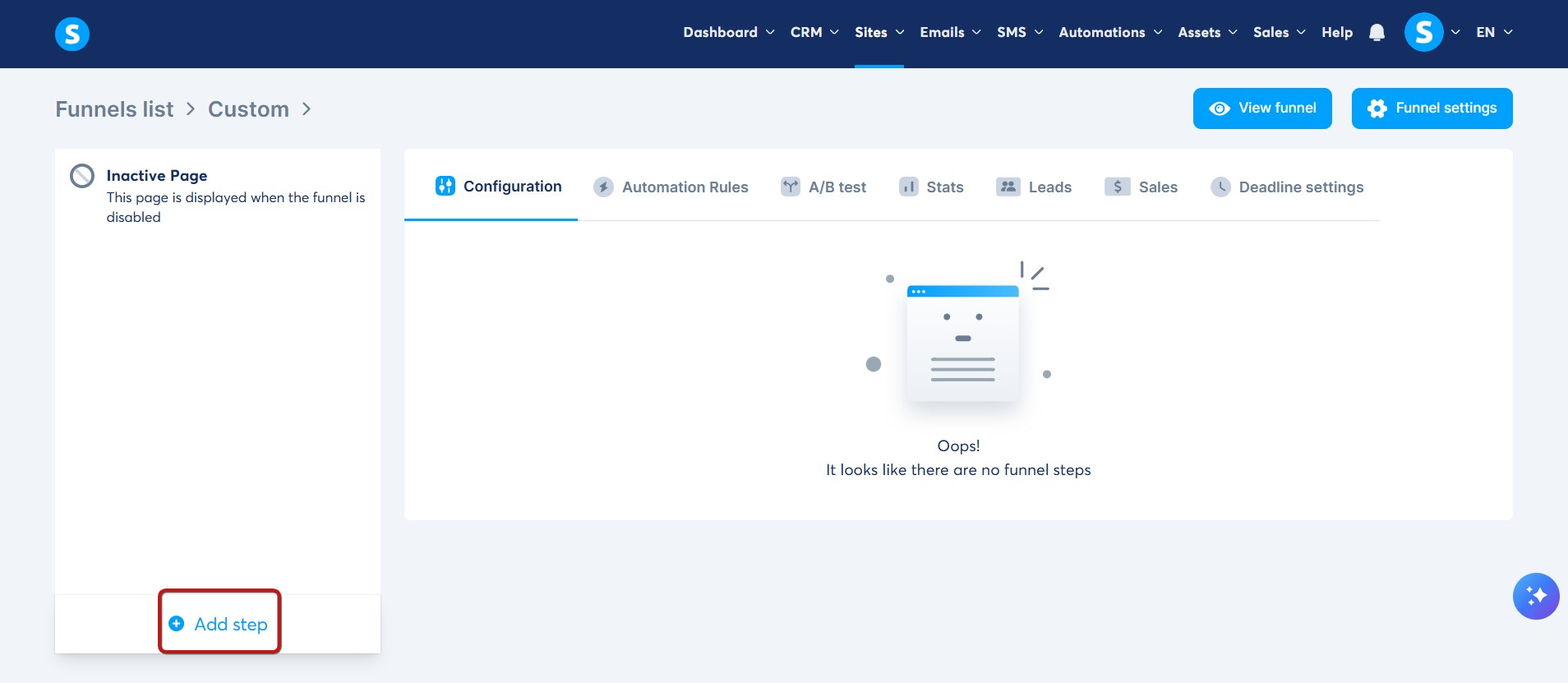 Siteler sekmesine gidin ve Satış hunileri'ne (1) tıklayın. Ardından, Oluştur'a (2) tıklayın.