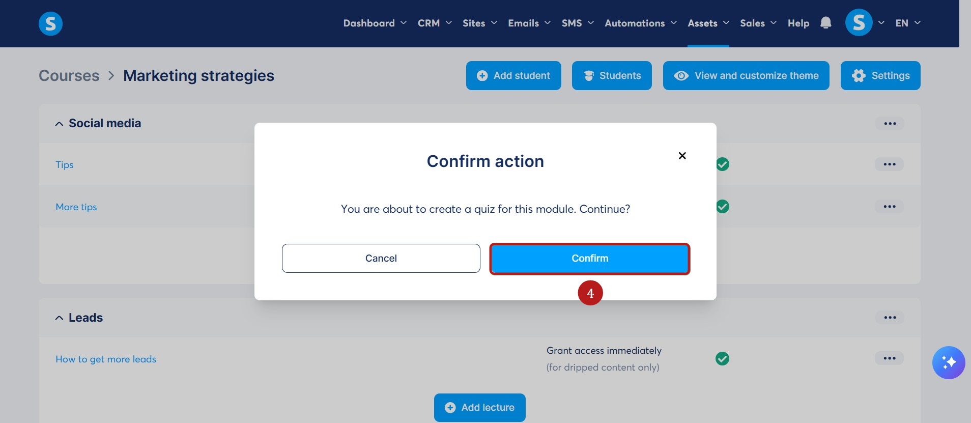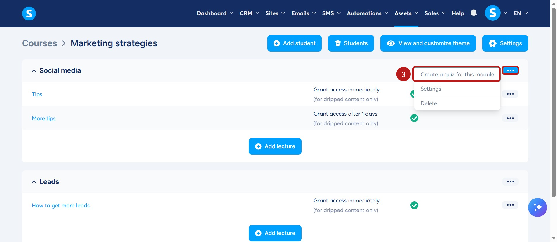 İstediğiniz modüle gidin, "..." seçeneğine tıklayın ve ardından Bu modül için bir sınav oluştur seçeneğine tıklayın (3).