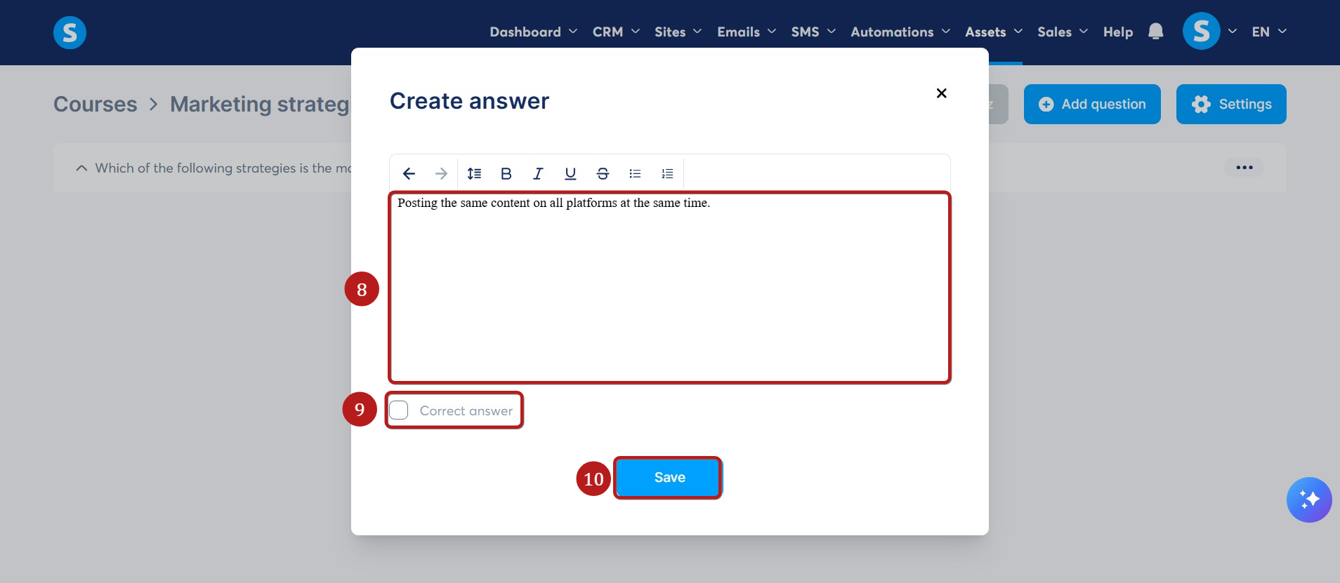 Cevabınızı girin (8). Yanlış cevaplar için "Doğru cevap" kutusunun işaretini kaldırın (9)