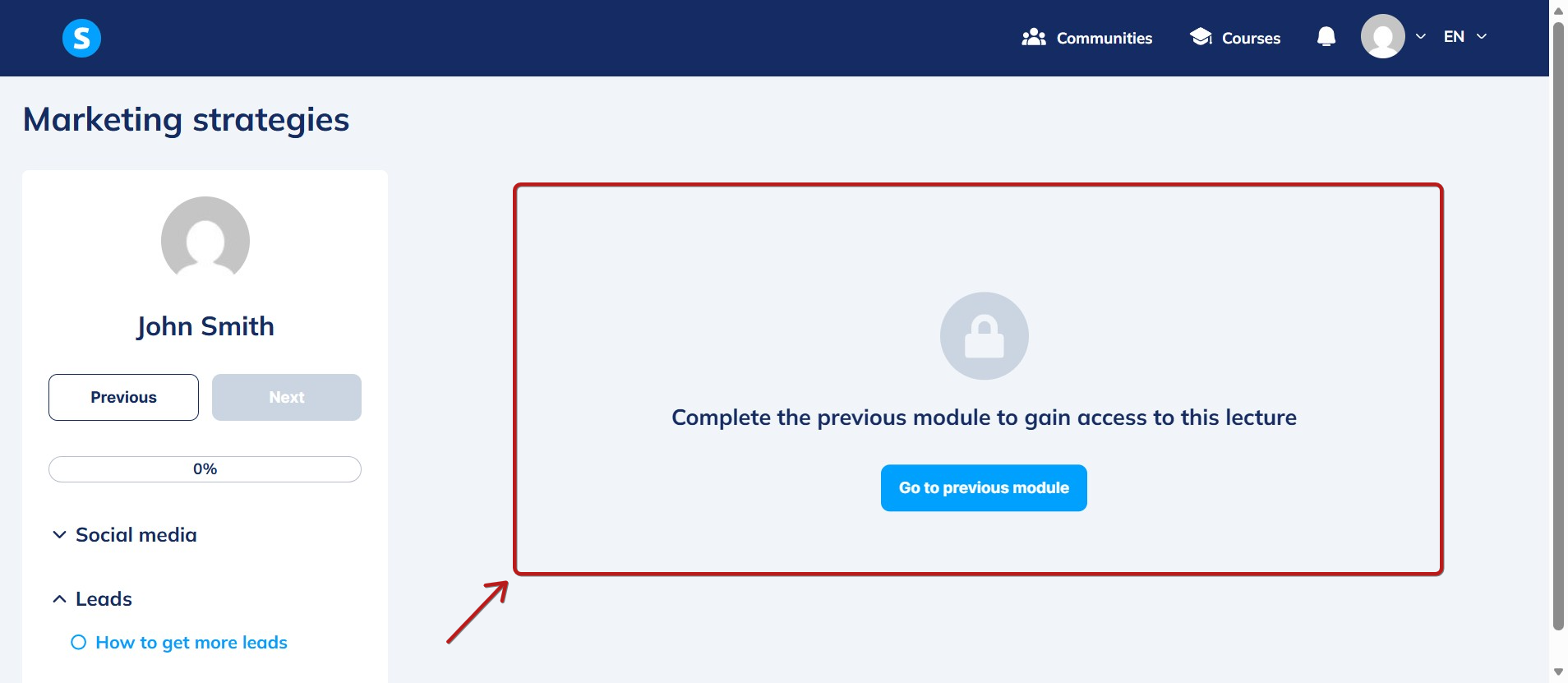 Bir öğrenci mevcut modülü tamamlamadan bir sonraki modülde ders açmaya çalışırsa aşağıdaki mesajı alır: