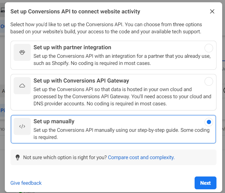 - Dönüşümler API'sini Kullanma yı seçin ve ardından "Manuel olarak ayarla"yı tıklayın.
