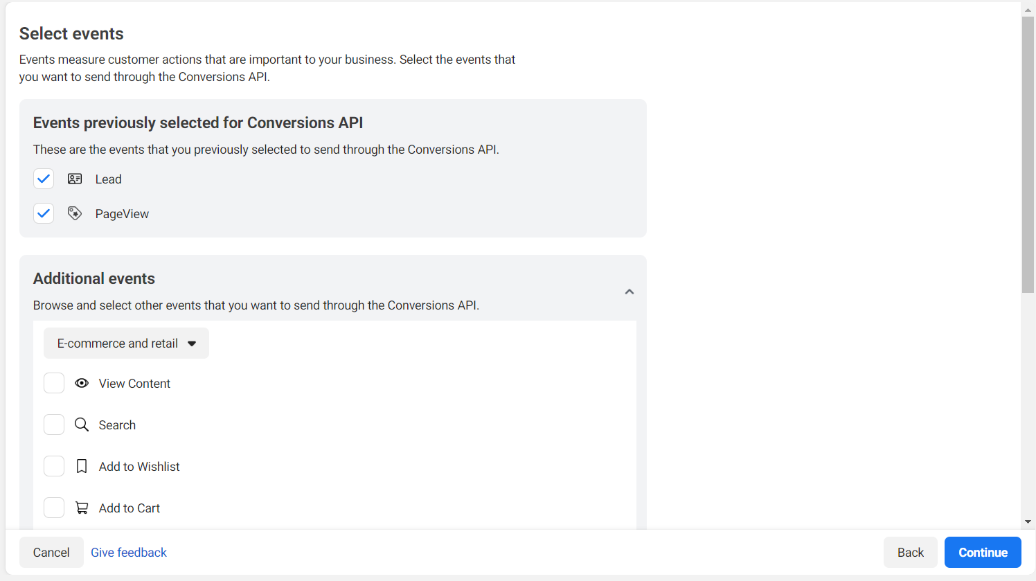 - Dönüşümler API'sı aracılığıyla göndermek istediğiniz etkinlikleri seçin. Sahip olduğunuz iş türüne göre etkinlik önerileri için açılır menüyü kullanın ve işiniz bittiğinde devam et'i tıklayın. (Bu örnek için "Potansiyel Müşteri" ve "Sayfa Görüntüleme"yi seçtik)