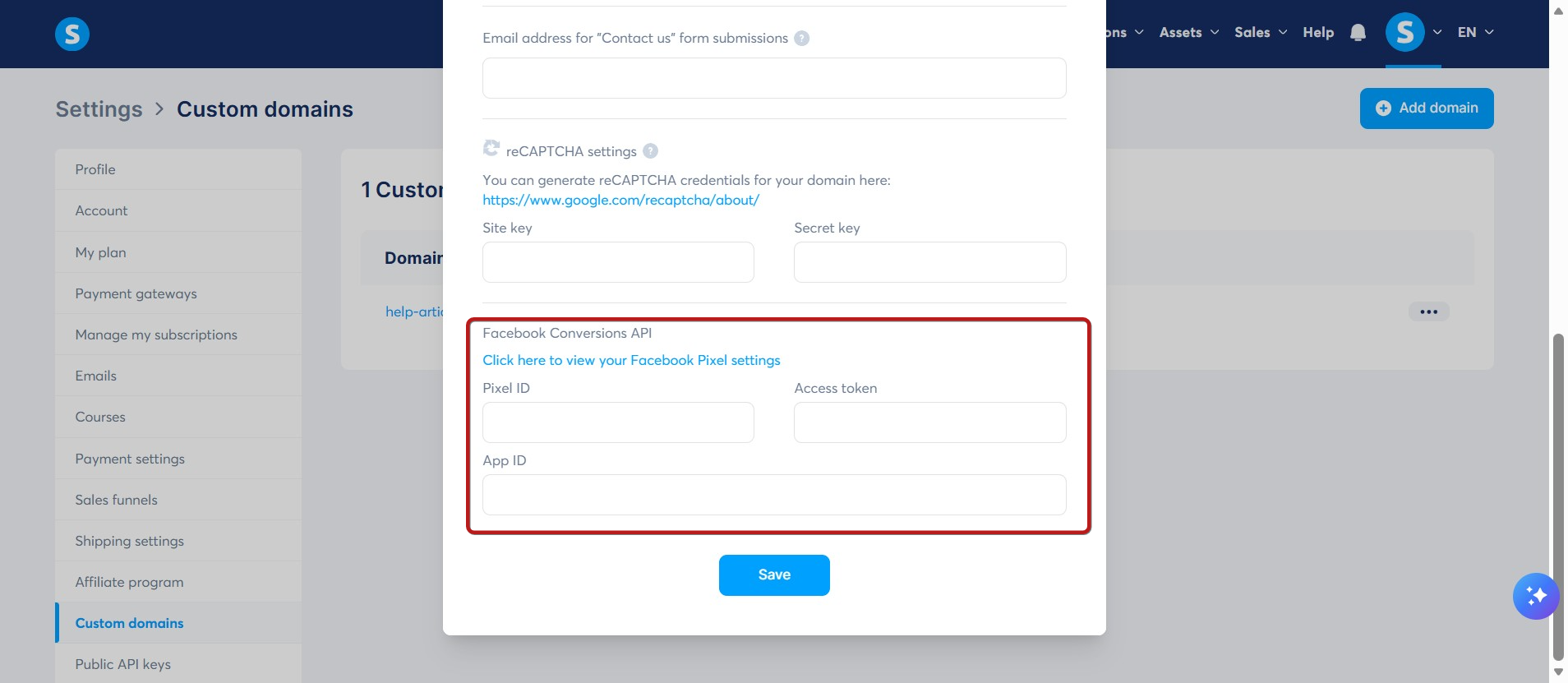 - Systeme.io hesabınızda, sağ üst köşedeki profil resminize tıklayın Ayarlar > Özel alanlar 3 noktayı tıklayın ve ardından alan adınızın ayarlarını görüntülemek için Ayarlar'ı seçin.