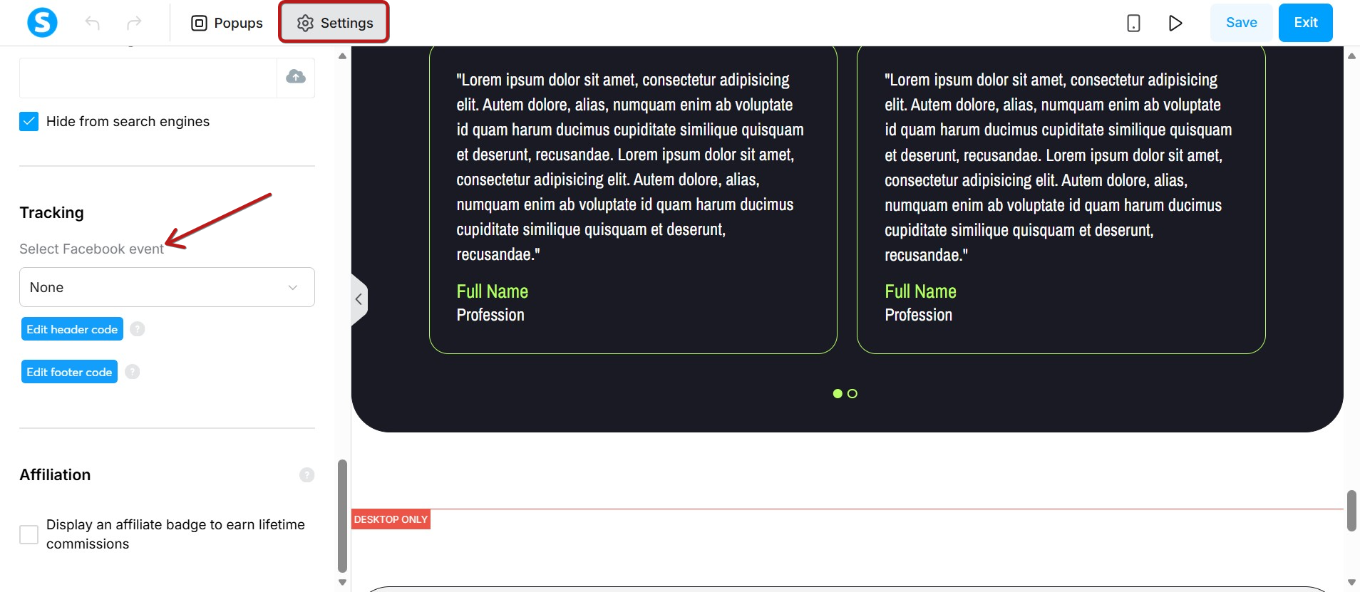 Son olarak, Dönüşüm API'sini kullanarak izlemek istediğiniz her sayfaya ilgili etkinliği ekleyin (Systeme.io düzenleyiciyi kullanarak sayfayı düzenlerken "Ayarlar" altında bulunabilir)