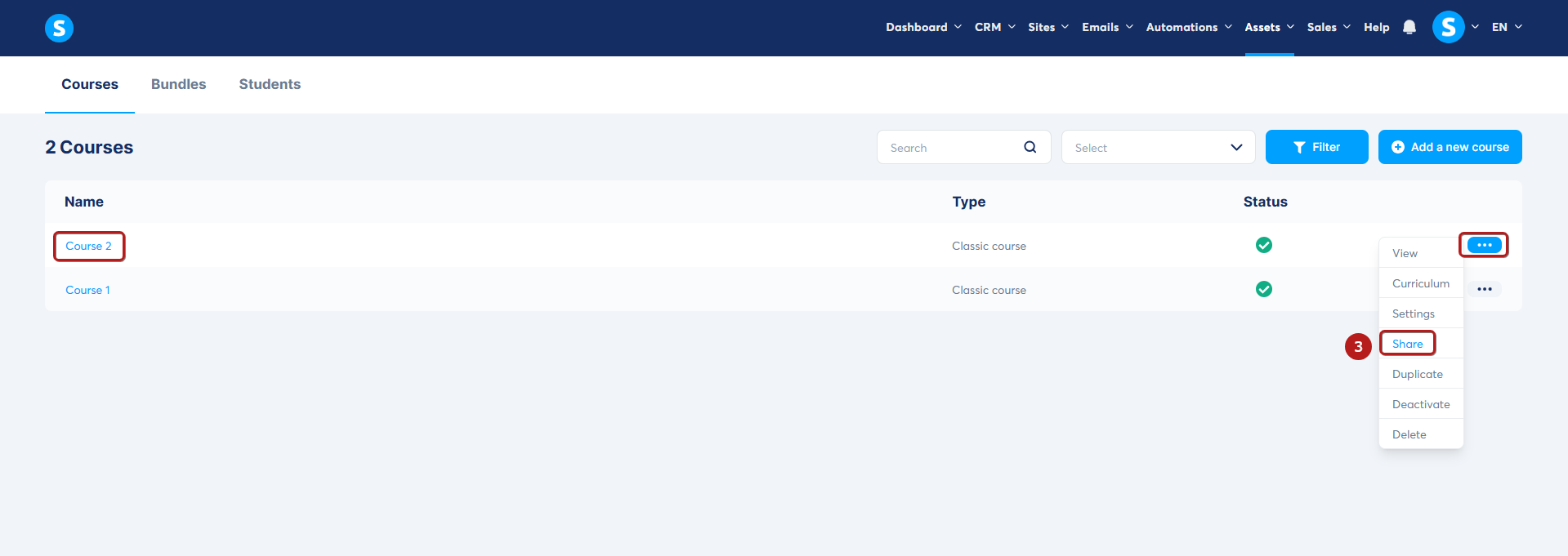 Kurs oluşturulduktan sonra 3 noktaya (3) tıkladıktan sonra "Paylaş"ı tıklayın.