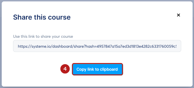Paylaşılan kursun URL'sini ve onu diğer systeme.io kullanıcılarıyla paylaşmanıza olanak tanıyan bir düğmeyi içeren bir açılır pencere görünecektir (4).