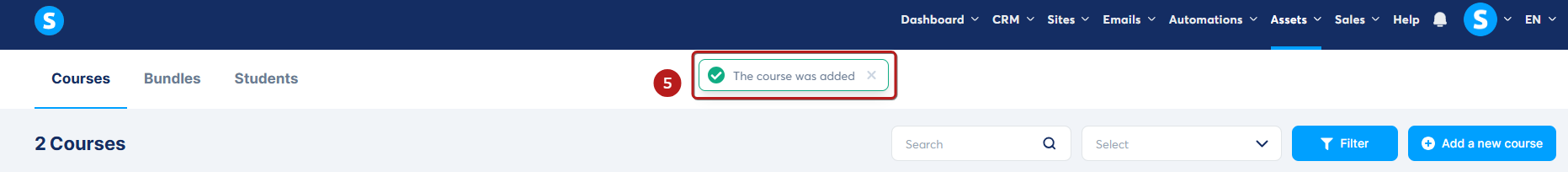 Varlıklar sekmesine gidin ve Kurslar (1)'ı seçin. Yeni bir kurs oluşturmak için Yeni kurs ekle (2)'ye tıklayın.