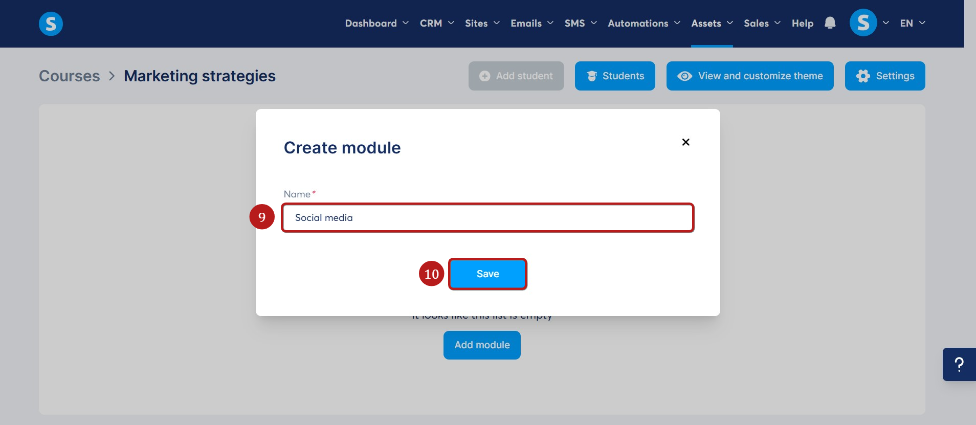 Ardından görünen açılır pencerede modüle bir "Ad" girin (9), ardından "Kaydet" seçeneğine tıklayın. (10)