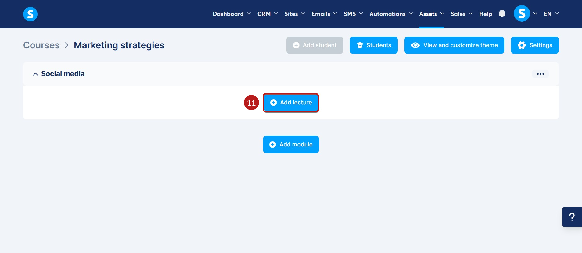 Modülünüzün içinde "Add lecture" düğmesine tıklayın (görselde 11 numaralı)
