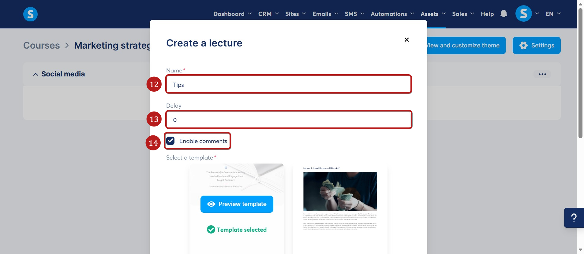 - Öğrencilerinize dersiniz hakkında yorum bırakma seçeneği sunmak istiyorsanız "Enable comments" kutusunu işaretleyin (görselde 14 numaralı)