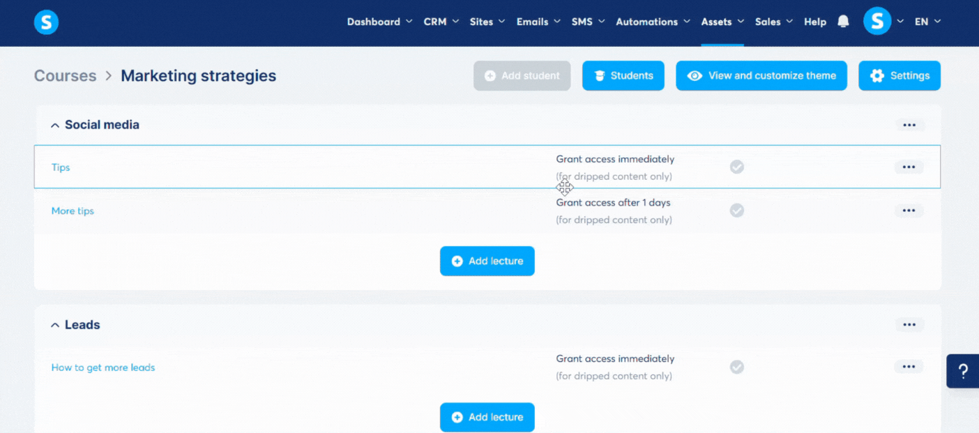 - Damla içerik:Bu, müşterilerinizin derslerinize tanımladığınız gecikmeye göre aşamalı olarak erişeceği anlamına gelir.