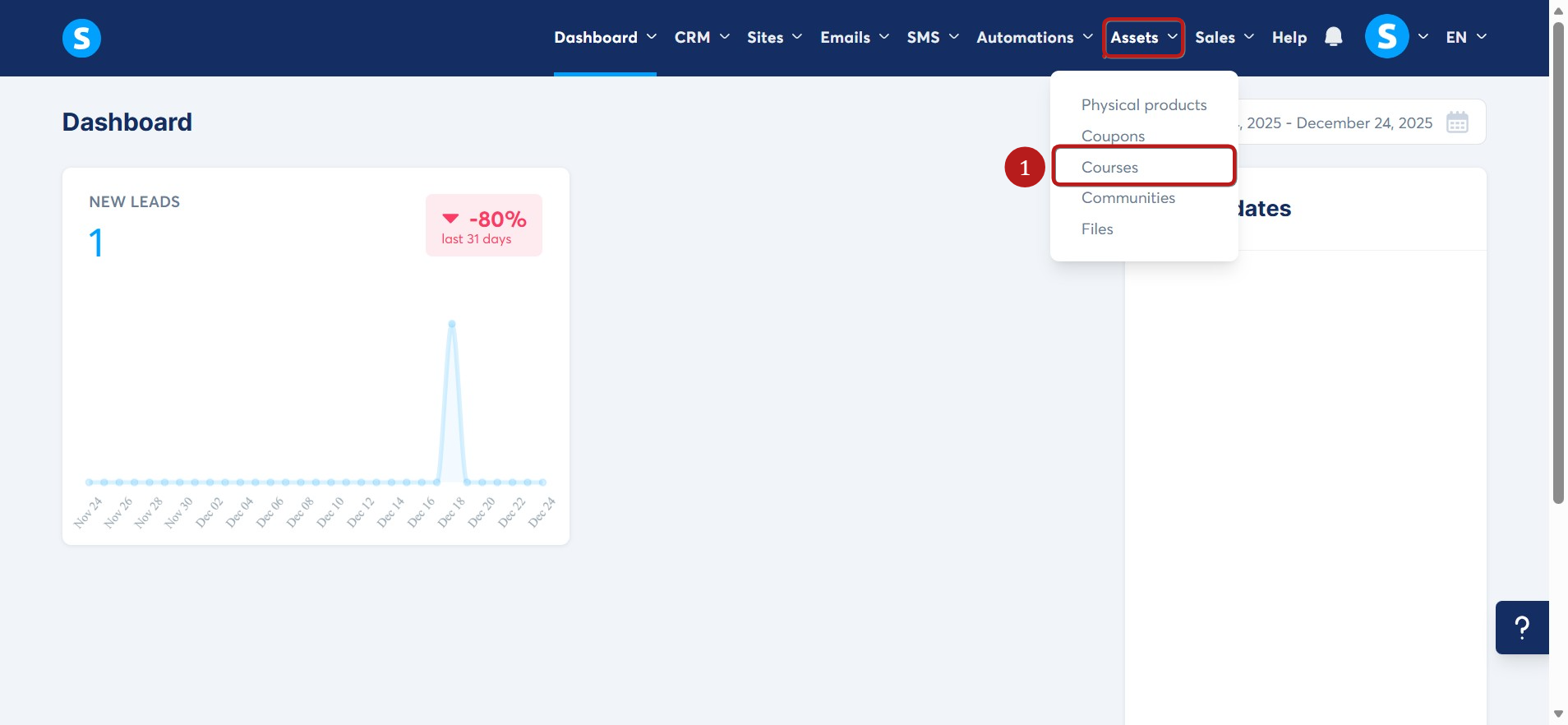 Gösterge panelinizdeki Varlıklar sekmesine tıklayarak kurslar bölümüne gidin ve ardından Kurslar'a (1) tıklayın.