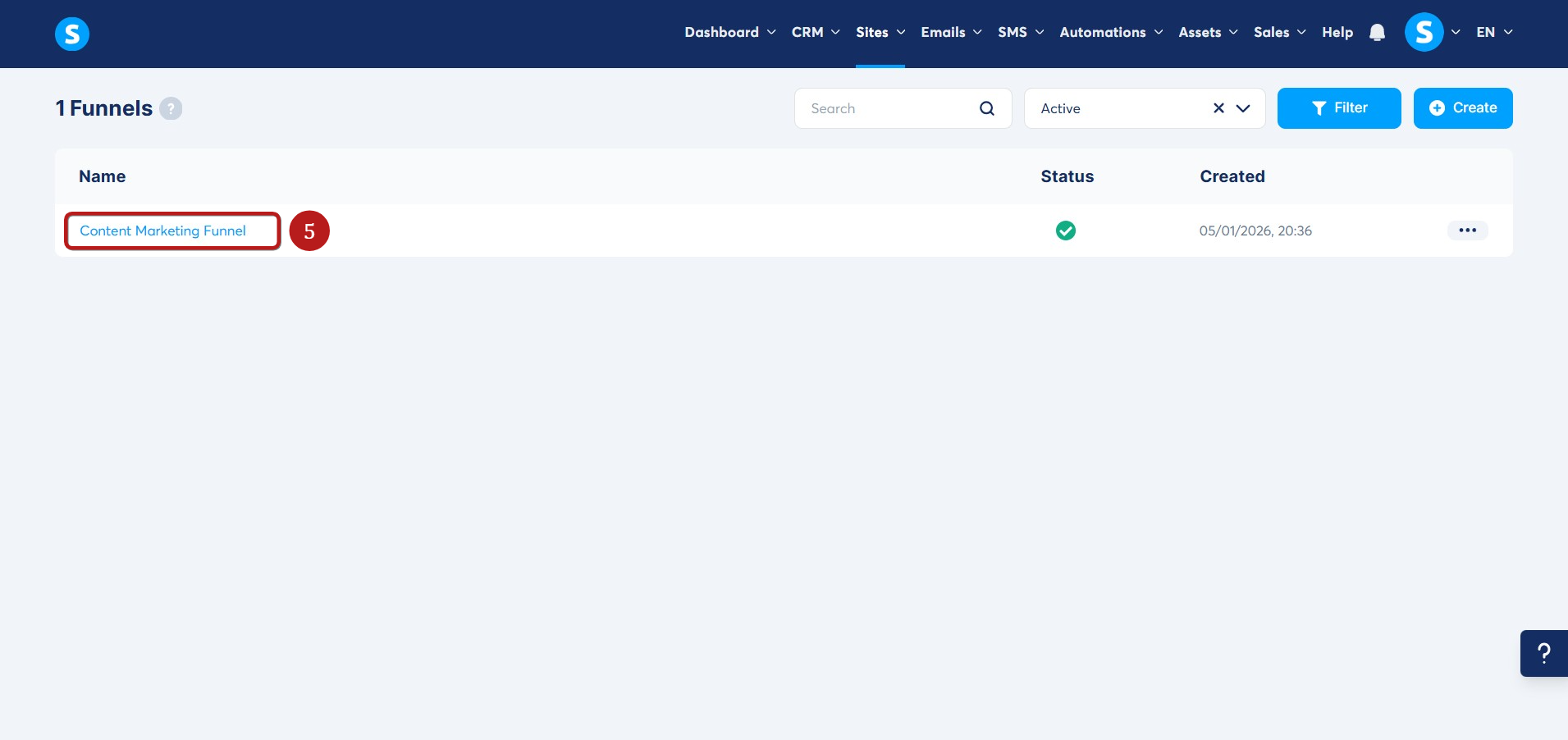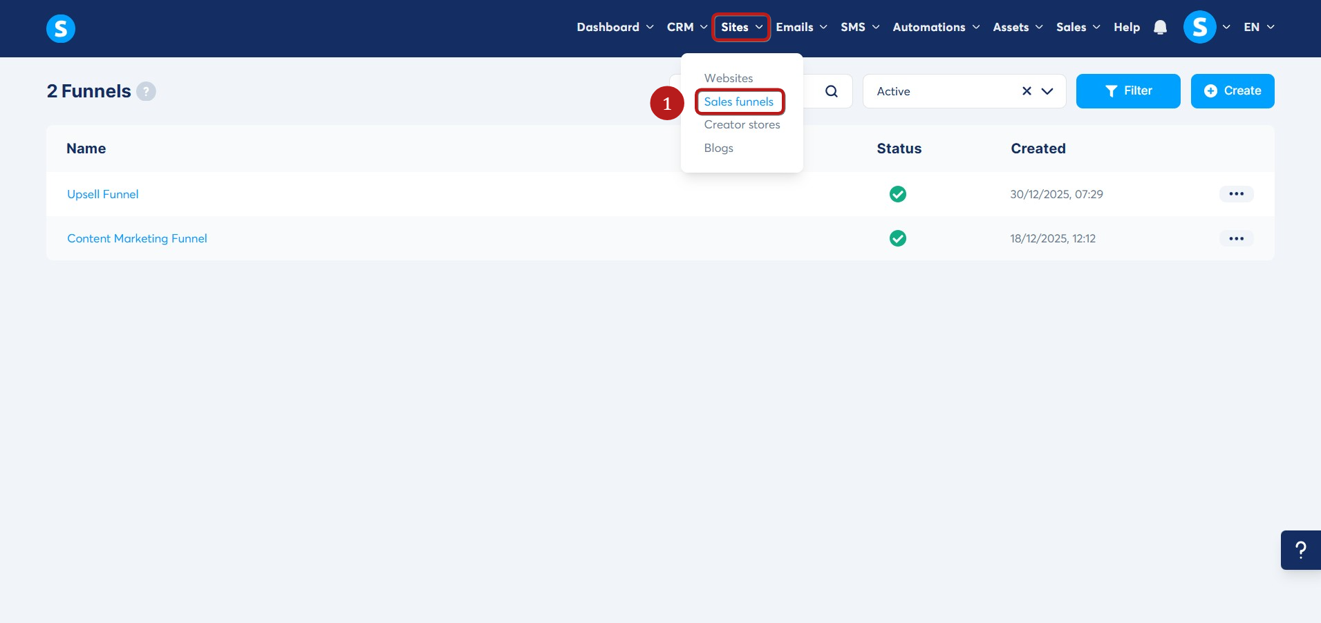 Siteler sekmesine gidin, ardından Satış hunileri seçeneğine tıklayın (1)