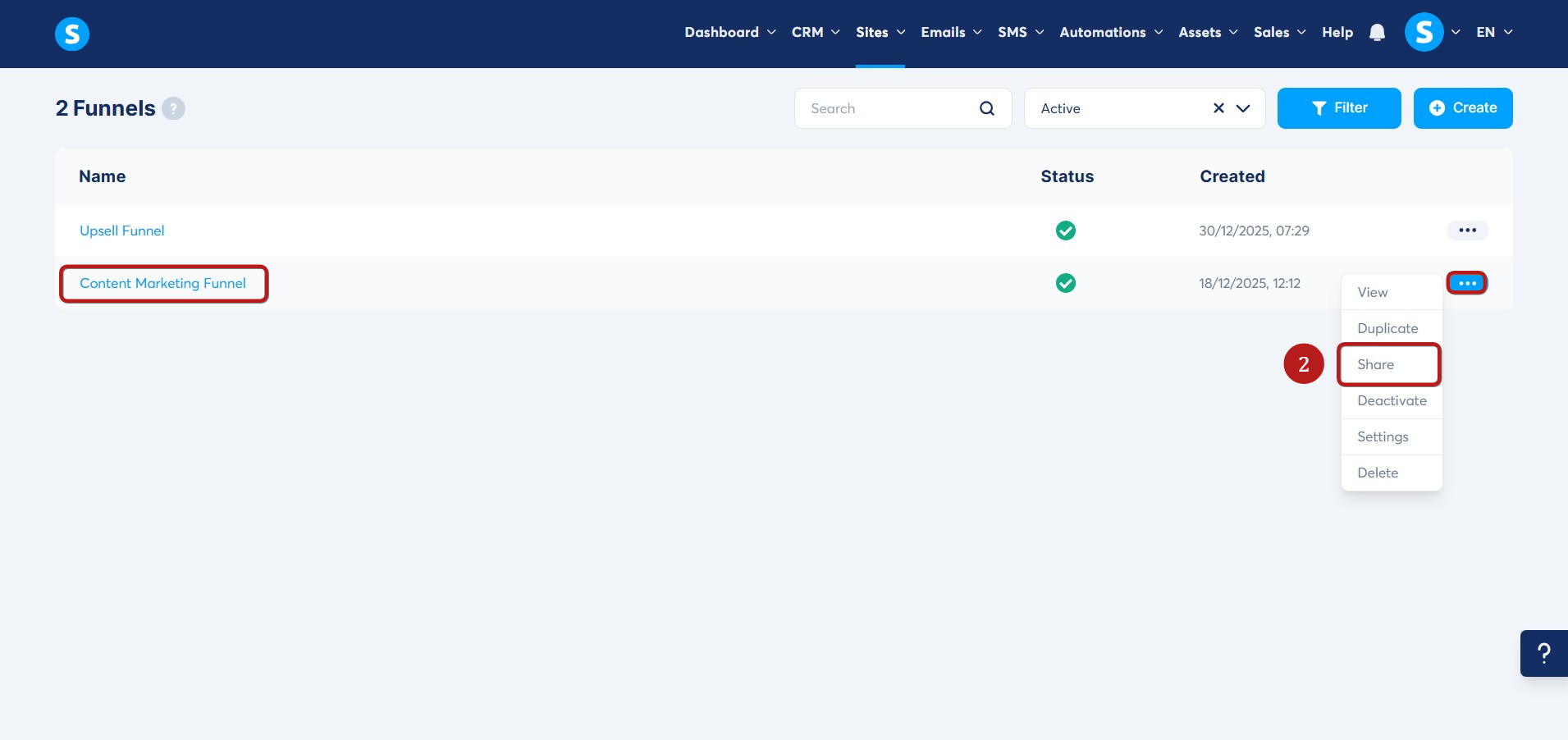 Paylaşmak istediğiniz satış hunisini seçin, üç noktanın üzerine gelin ve Paylaş seçeneğini seçin (2).