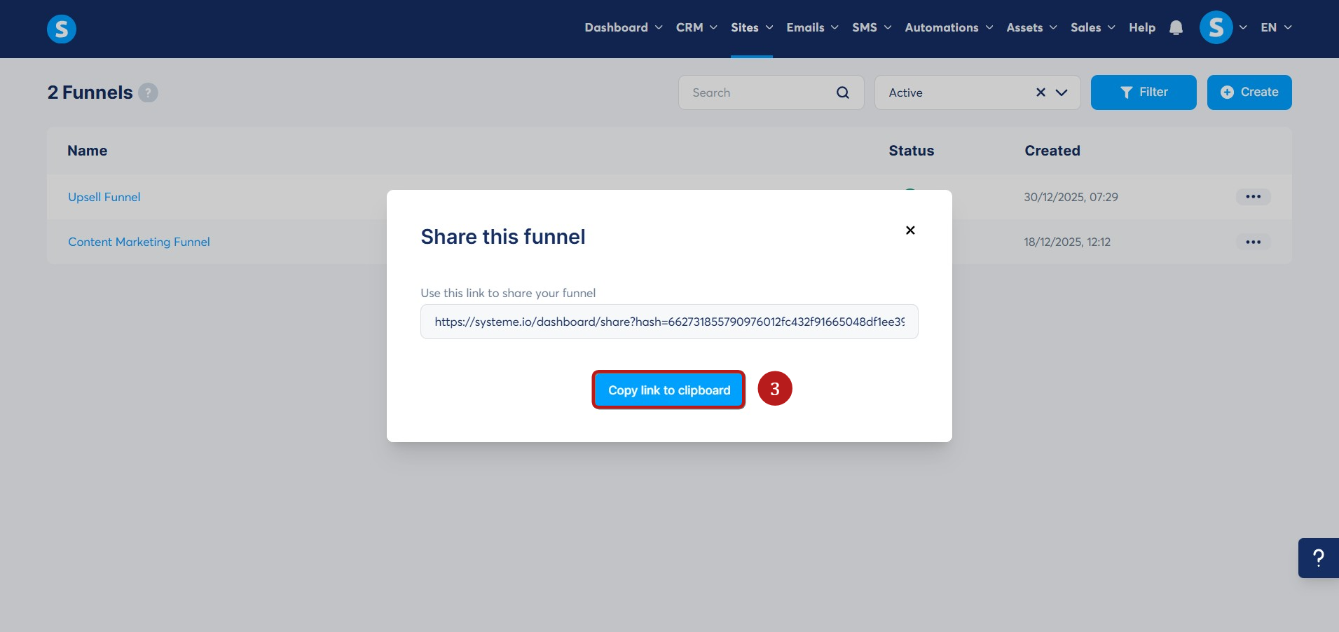 Son olarak bağlantıyı paylaşmak istediğiniz diğer systeme.io kullanıcılarıyla paylaşın.