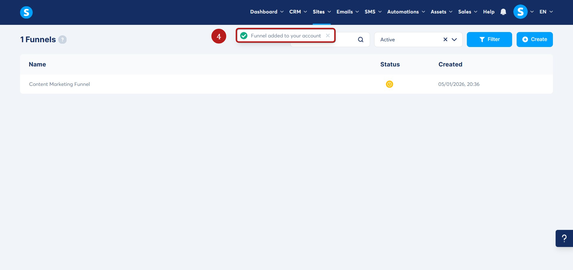 Kişileriniz dönüşüm hunisi paylaşım bağlantısını aldıktan sonra, önce systeme.io hesaplarında oturum açmaları, ardından aldıkları URL'yi tarayıcılarının URL çubuğuna yapıştırmaları gerekir. Huninin hesaplarına başarıyla eklendiğini belirten bir mesaj görünecektir (4).
