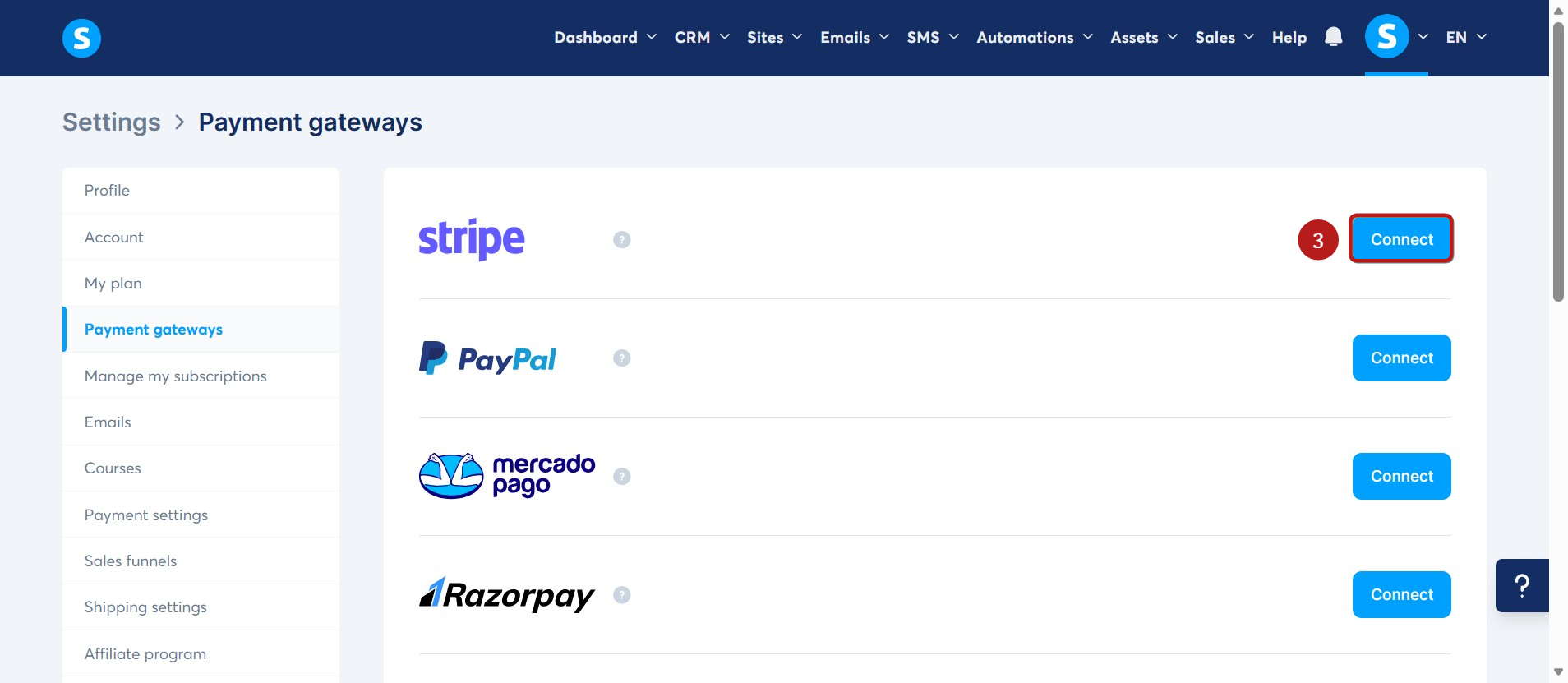 Ödeme geçidi seçenekleri sayfasında, Stripe seçeneği için Connect'e (3) tıklayın.