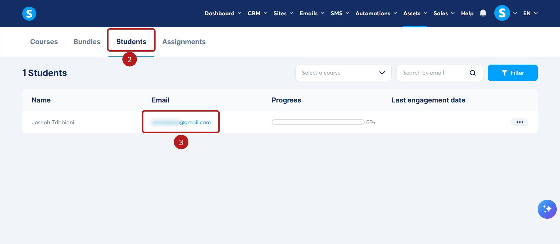 Kurslarınıza erişimi olan tüm öğrencilerinizin listesini görmek için Öğrenciler sekmesine (2) erişin. Öğrencinin profil sayfasına gitmek için bir öğrencinin e-posta adresine tıklayın (3).