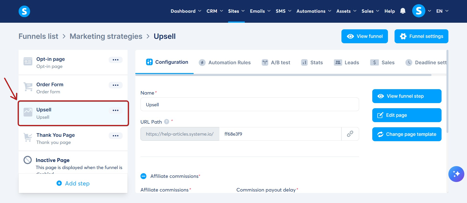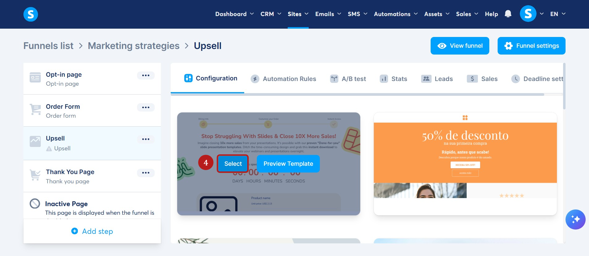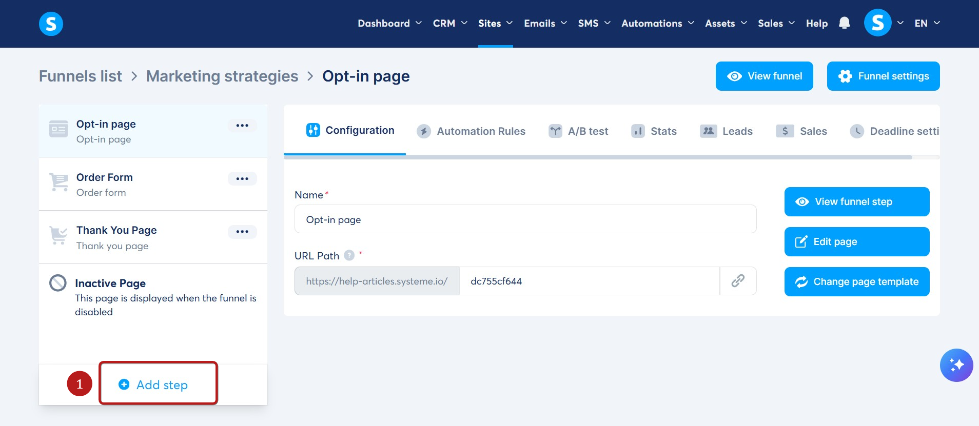 Upsell veya downsell sayfası eklemek istediğiniz satış hunisine gidin, ardından sol taraftaki huni sayfaları menüsünde Add step seçeneğine tıklayın. (1)