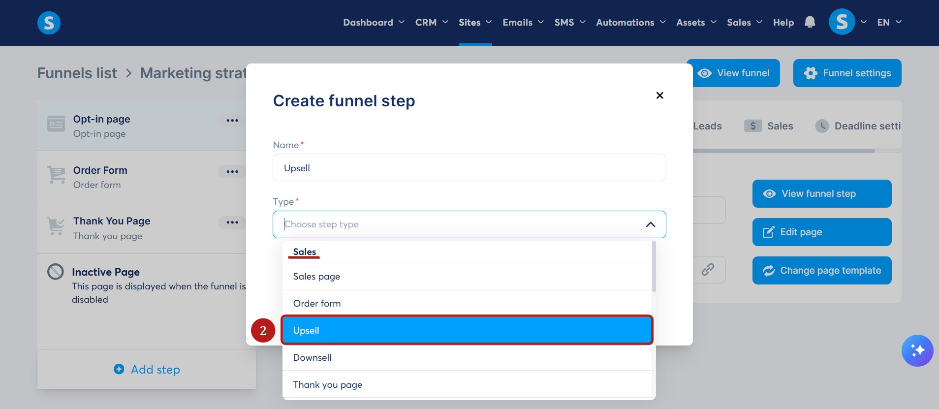 Oluşturma huni adımı açılır penceresinde, Tür olarak Upsell veya Downsell'ı seçin (2).