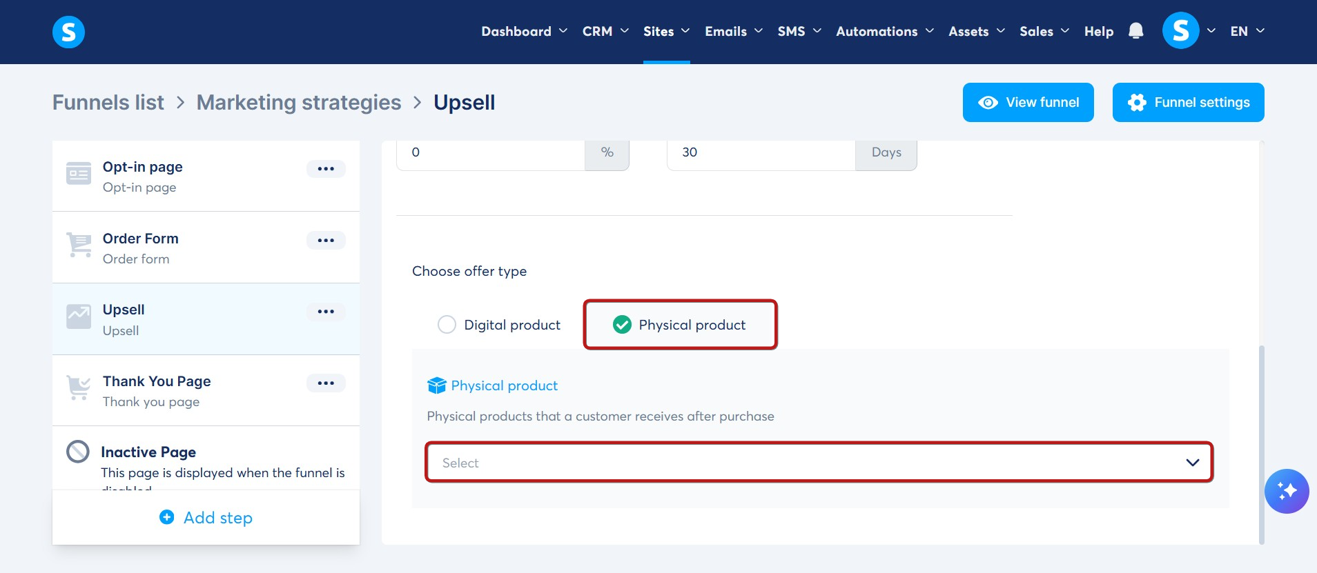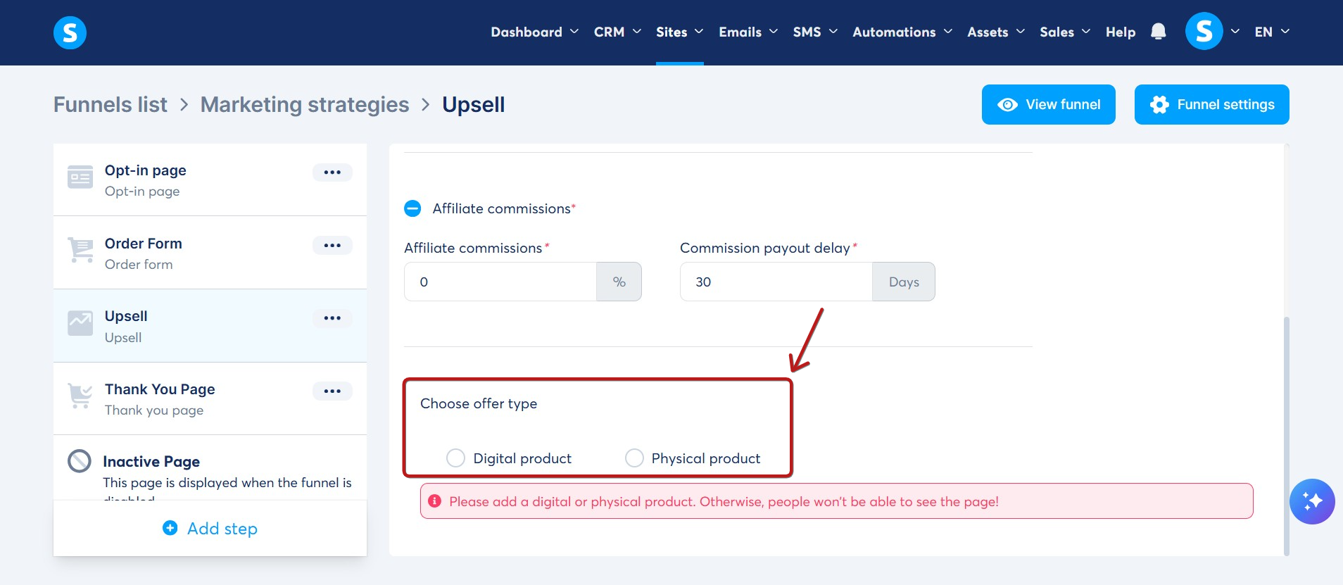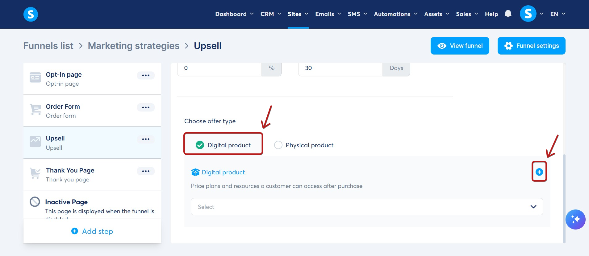 Satış huninizde, upsell/downsell sayfasını seçin. Ardından, teklif türlerinden Dijital ürün seçeneğini seçin.