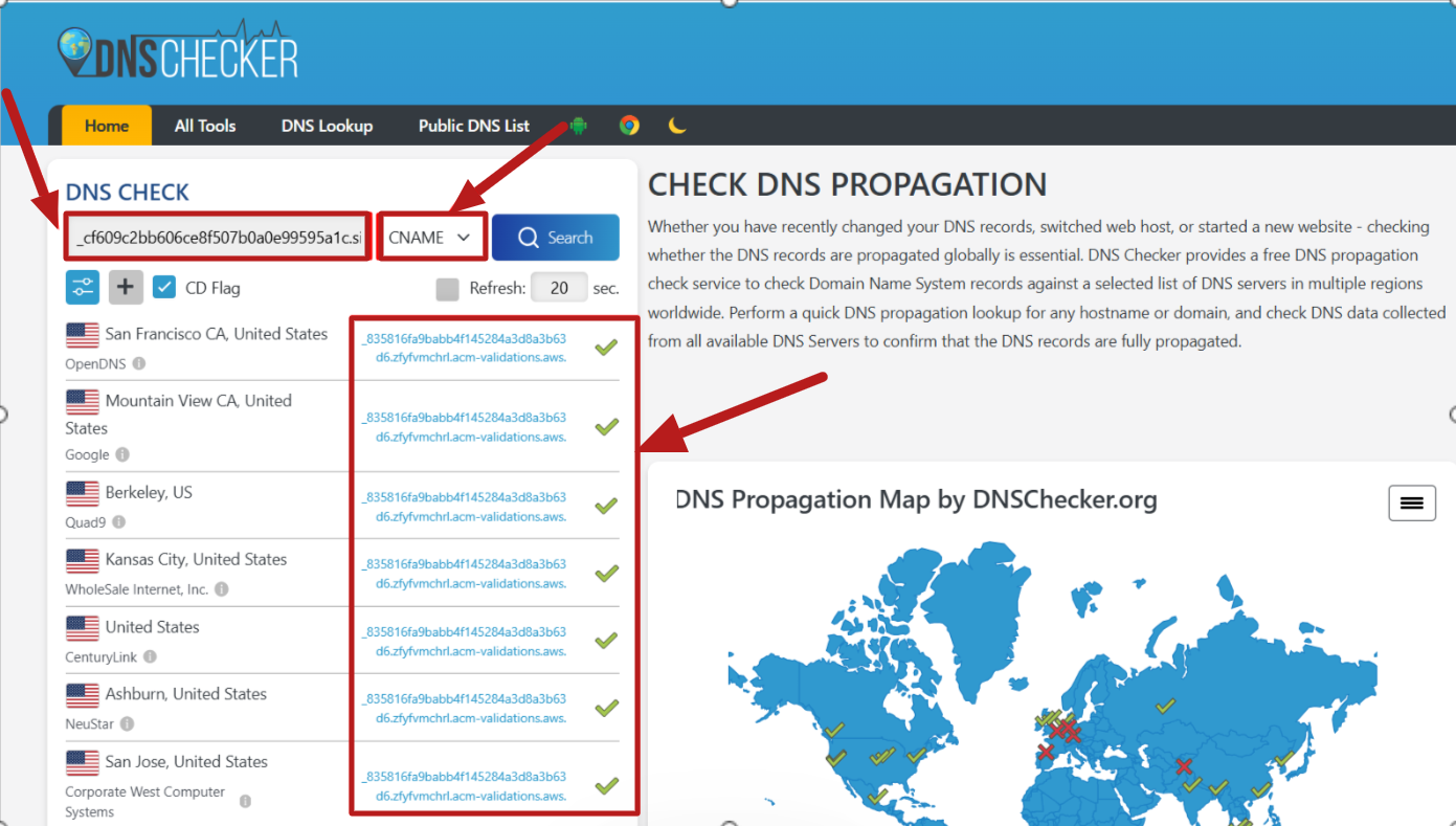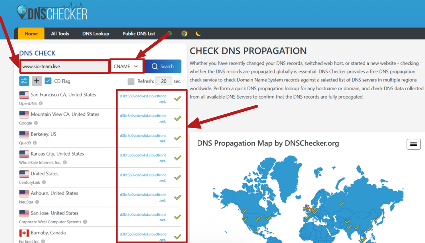 İki CNAME hostunuza eklendikten sonra, yayılımlarını aşağıdaki siteden kontrol edebilirsiniz: https://dnschecker.org/