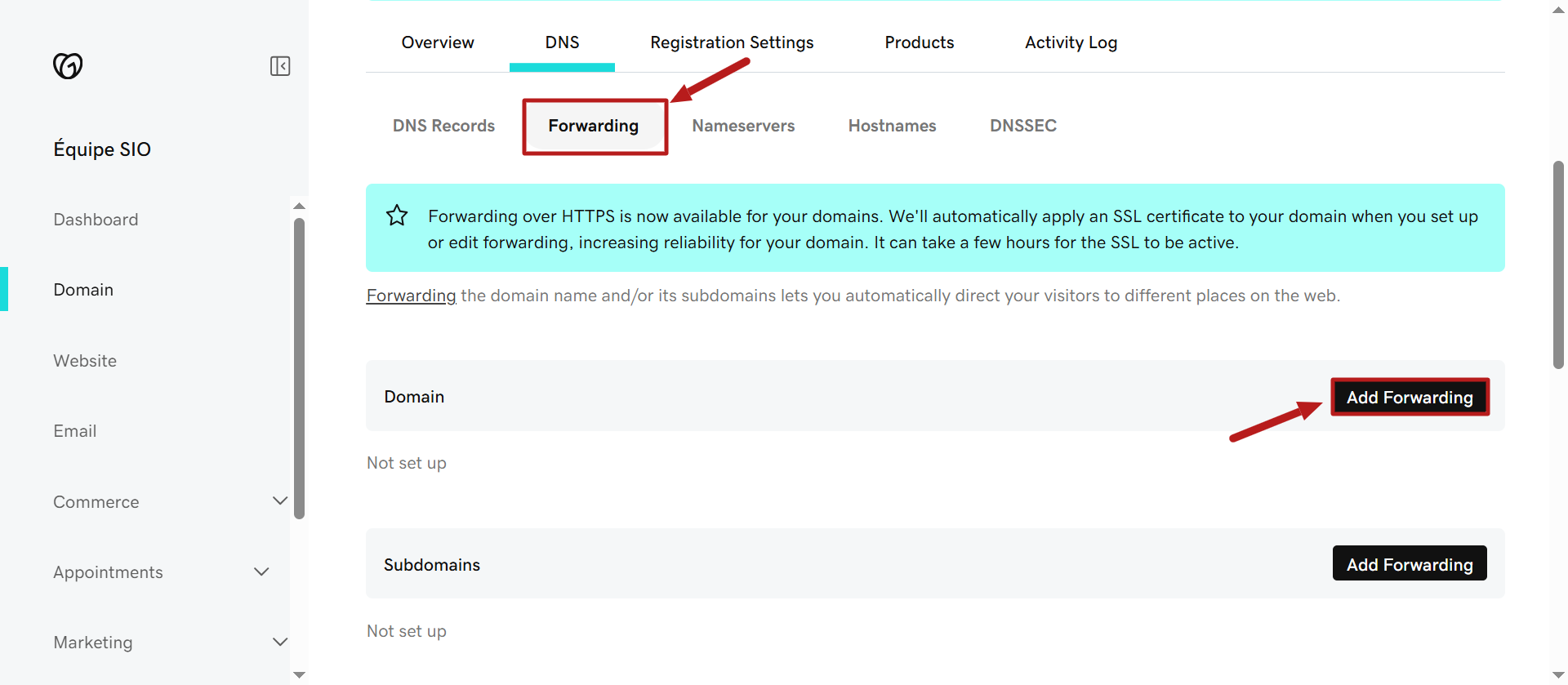 - Bir alan adı için Forwarding ve ardından Add forwarding üzerine tıklayın