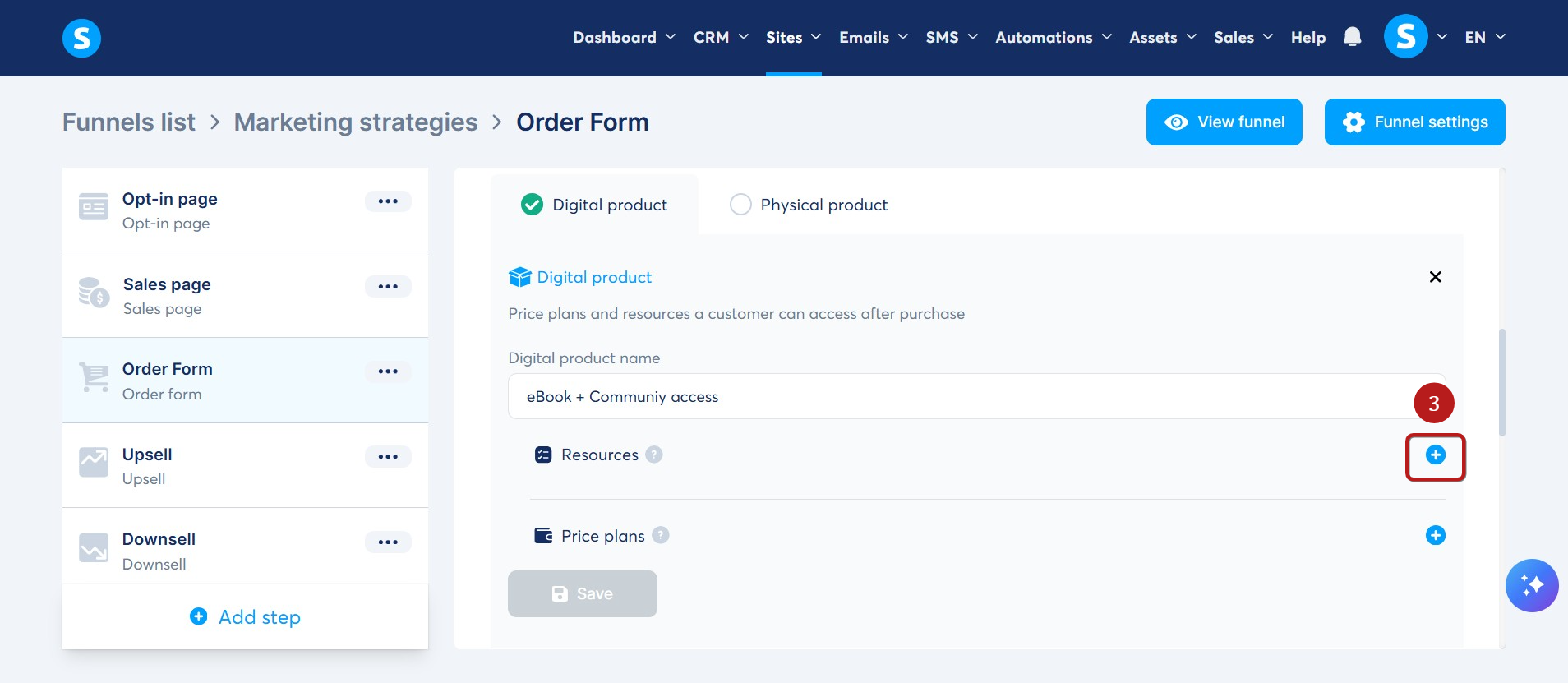 Satış huninizde önce ödeme sayfanıza tıklayın, ardından ödeme sayfanızdaki iki farklı teklif türünden Dijital Ürün ü seçmelisiniz (1). Ardından, yeni bir dijital ürün oluşturmak için (+) seçeneğine tıklayın. (2)