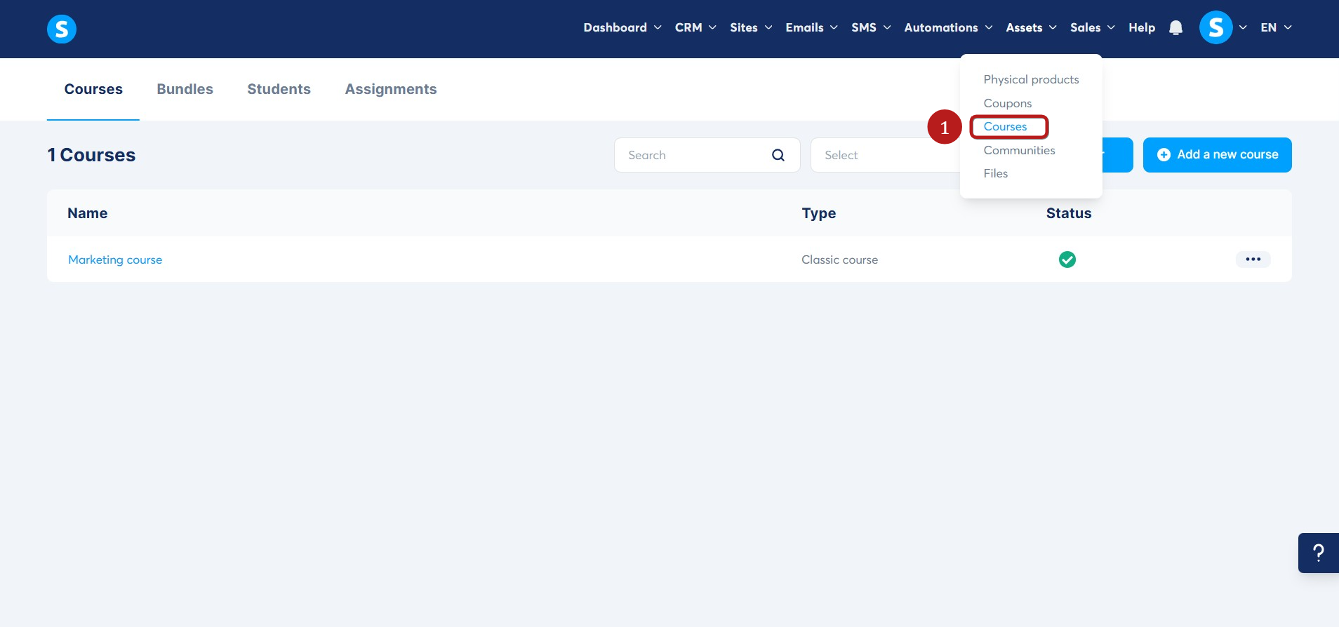 Varlıklar sekmesine gidin ve ardından Kurslar'a (1) tıklayın.