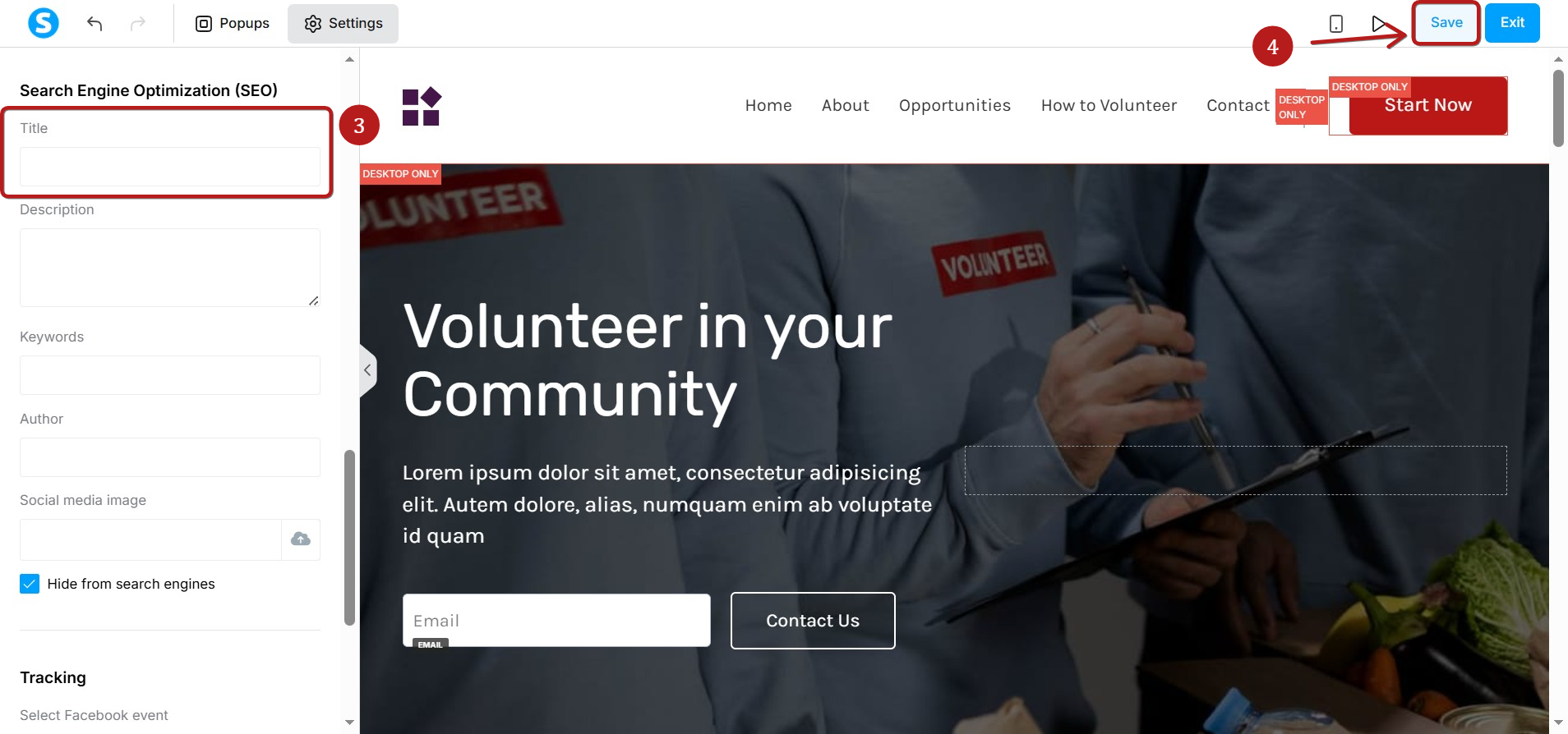 Yan menüde “Arama Motoru Optimizasyonu (SEO)” bölümüne ilerleyin ve “Başlık” alanına görüntülenecek başlığı girin (3).