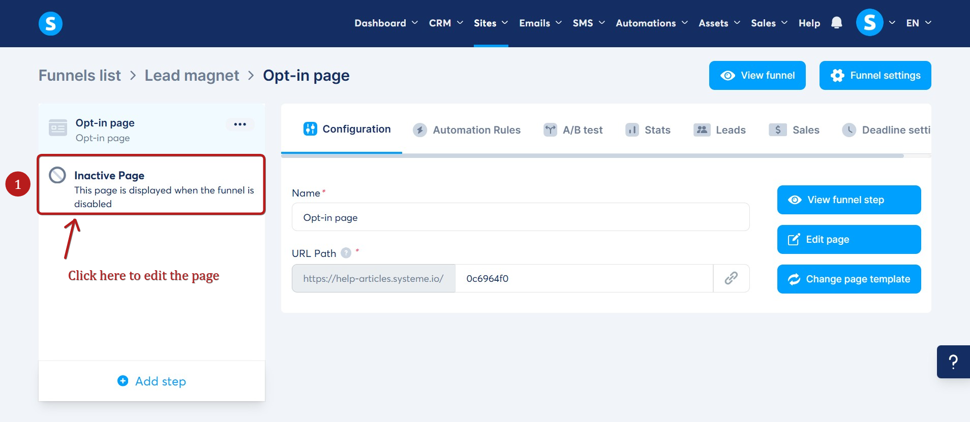 Öncelikle, devre dışı bırakılmış satış hunisine gidin, ardından özelleştirebilmeniz için Inactive page seçeneğine tıklayın (1).