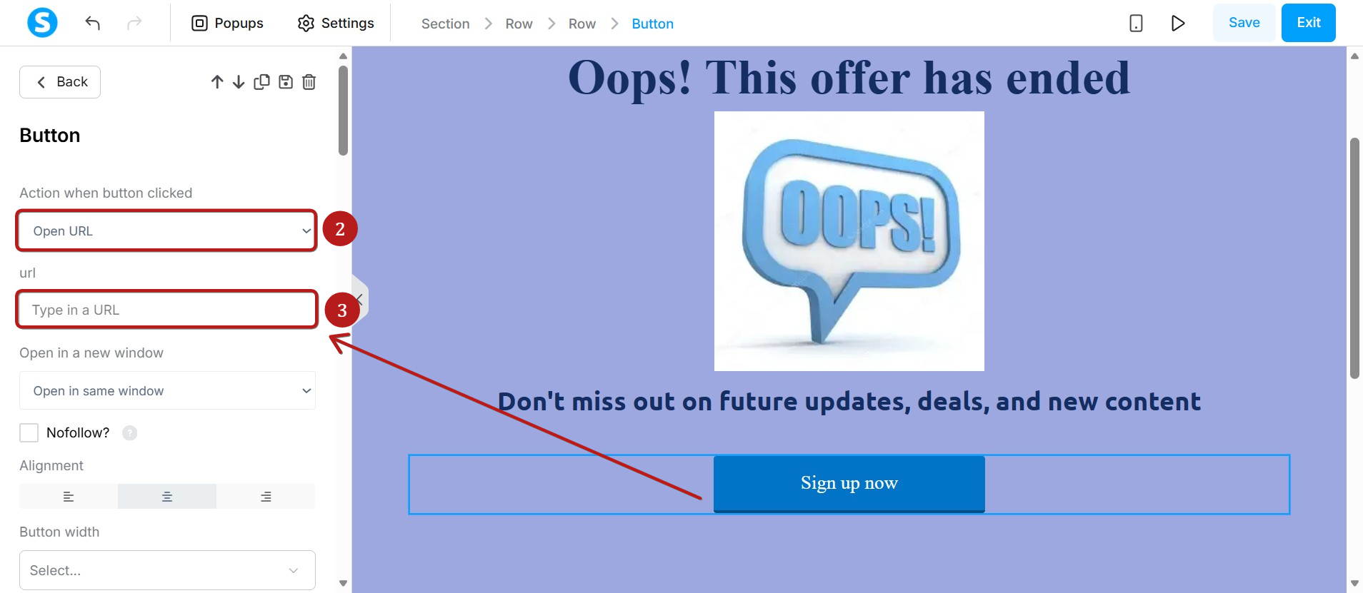 Sayfaya istenen öğeleri ekledikten sonra, düğmeyi open a URL olarak yapılandırın (2).