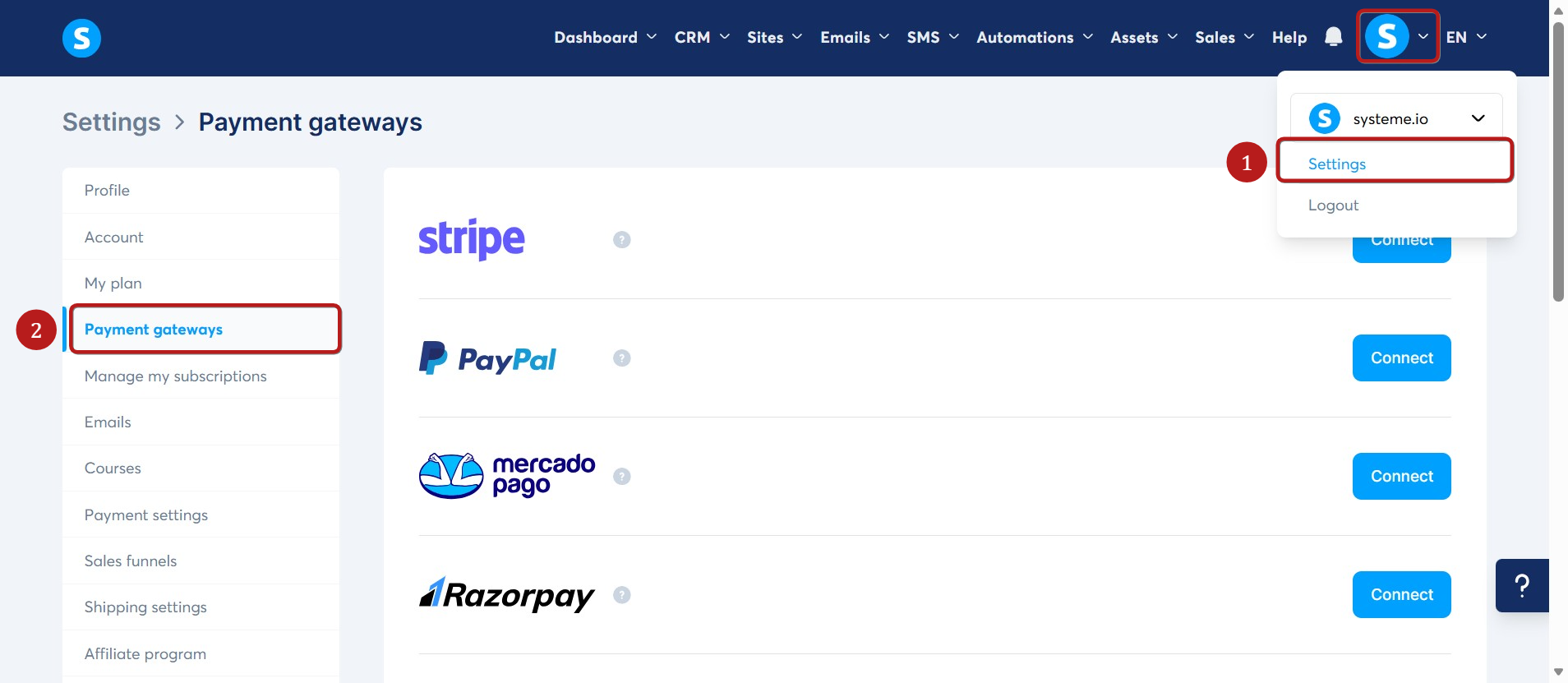 systeme.io hesabınızdan profil resminize tıklayın ve Settings'i seçin (1), ardından Payment gateways'e gidin (2).
