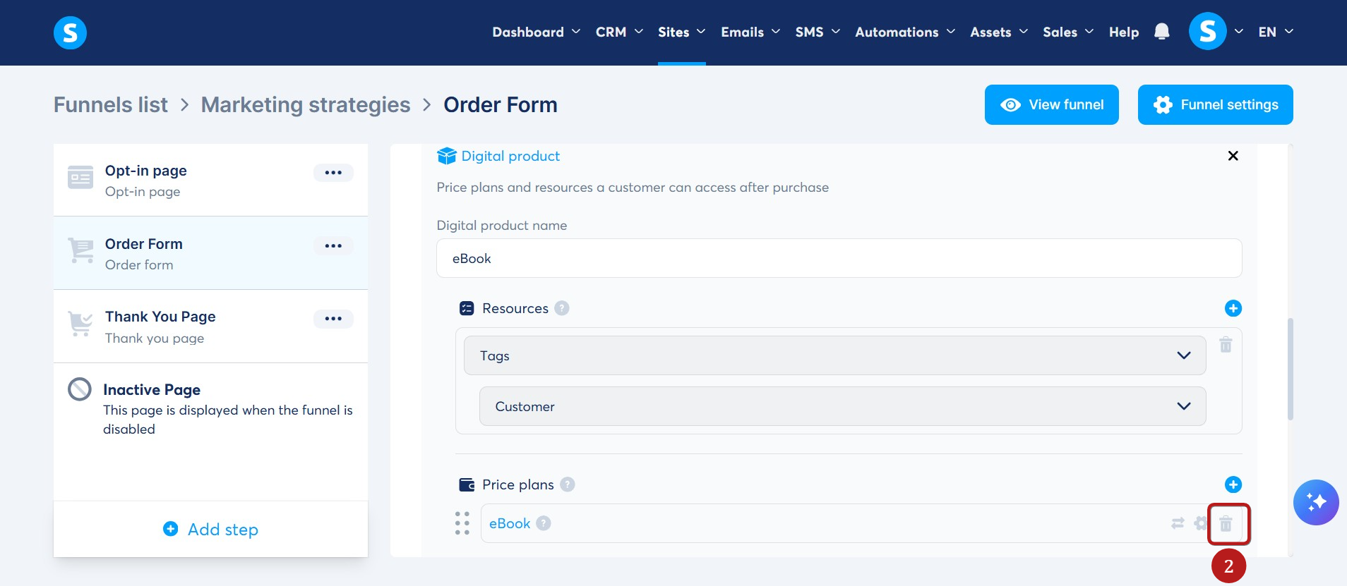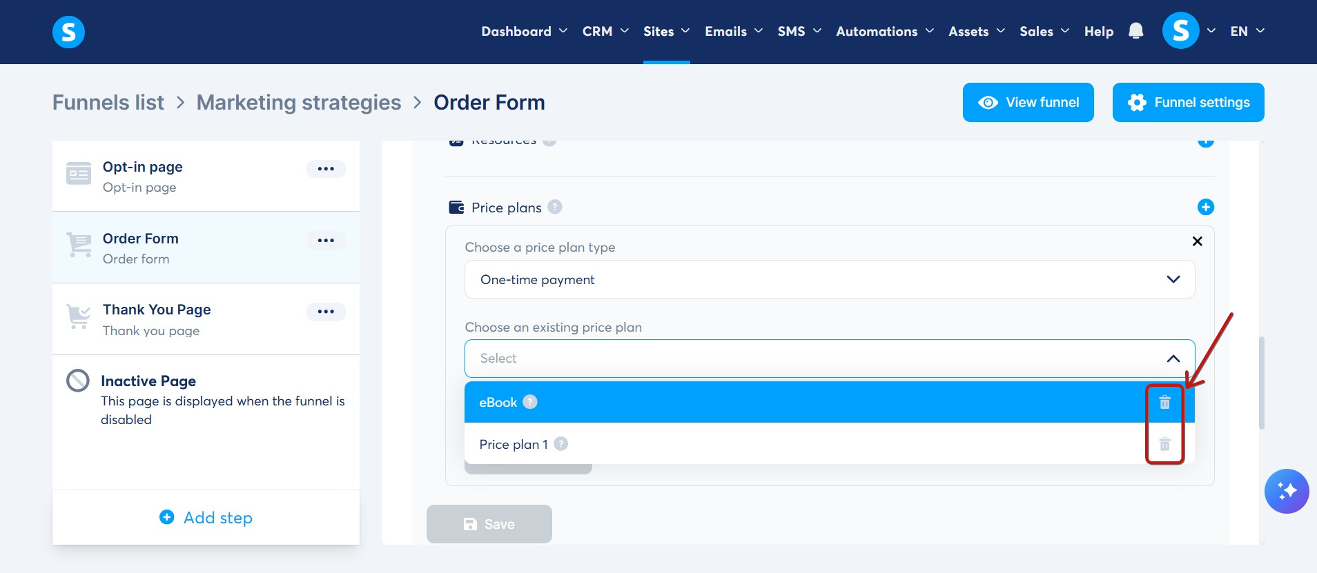 Ardından fiyat planlarınızın sağındaki Çöp Kutusu (2) simgesine tıklayın.