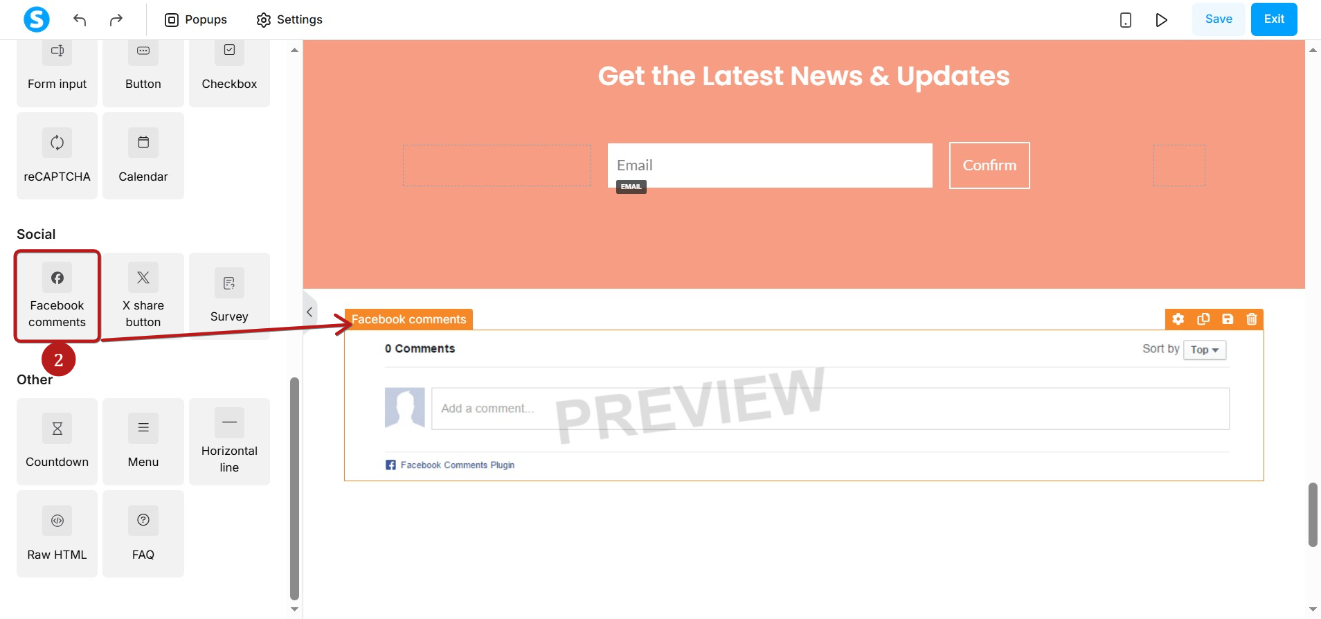 Sayfanızdaki “Facebook Yorumları” öğesini istediğiniz konuma sürükleyin (2).