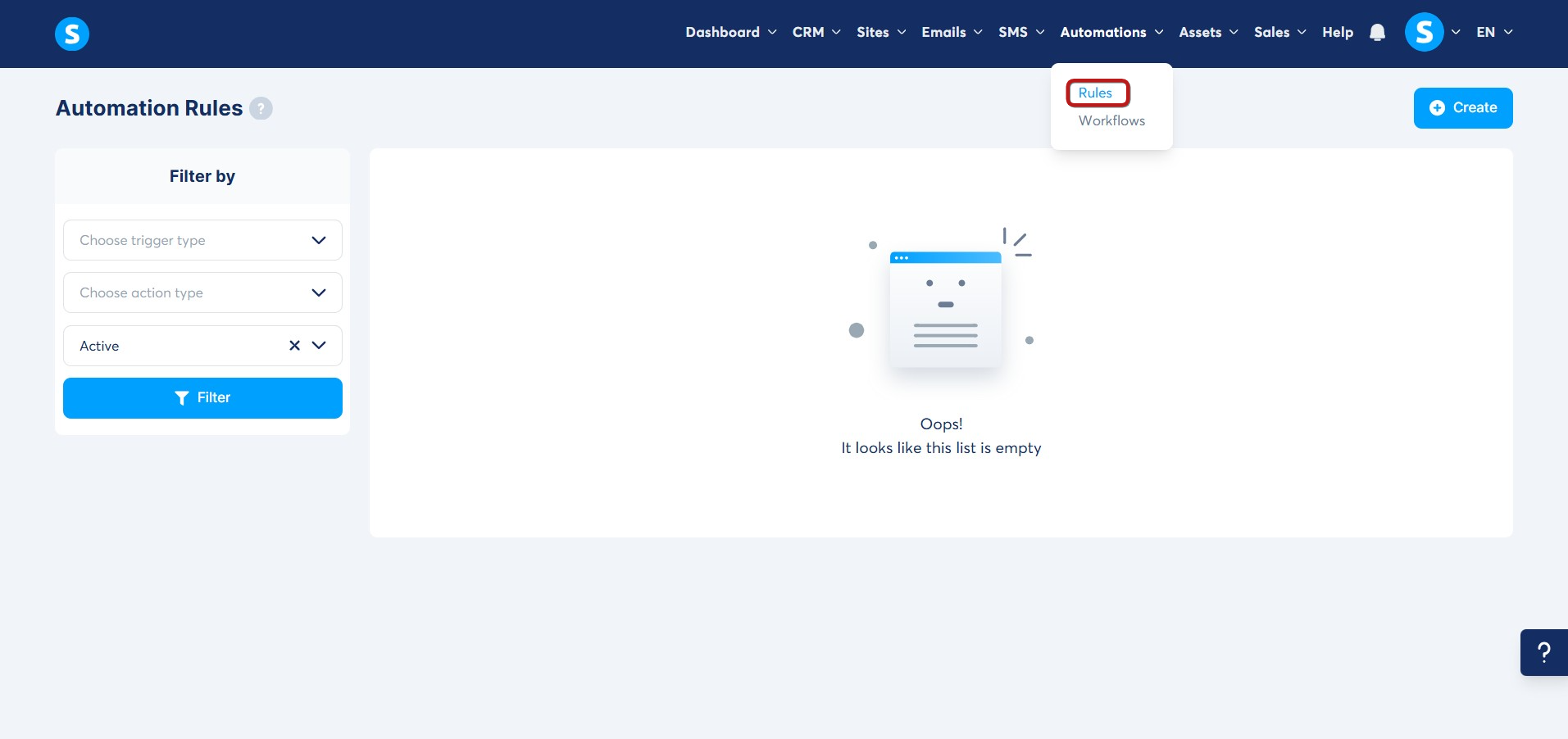 Yeni bir otomasyon kuralı oluşturmak için Otomasyonlar >> Kurallar yolunu izleyin.