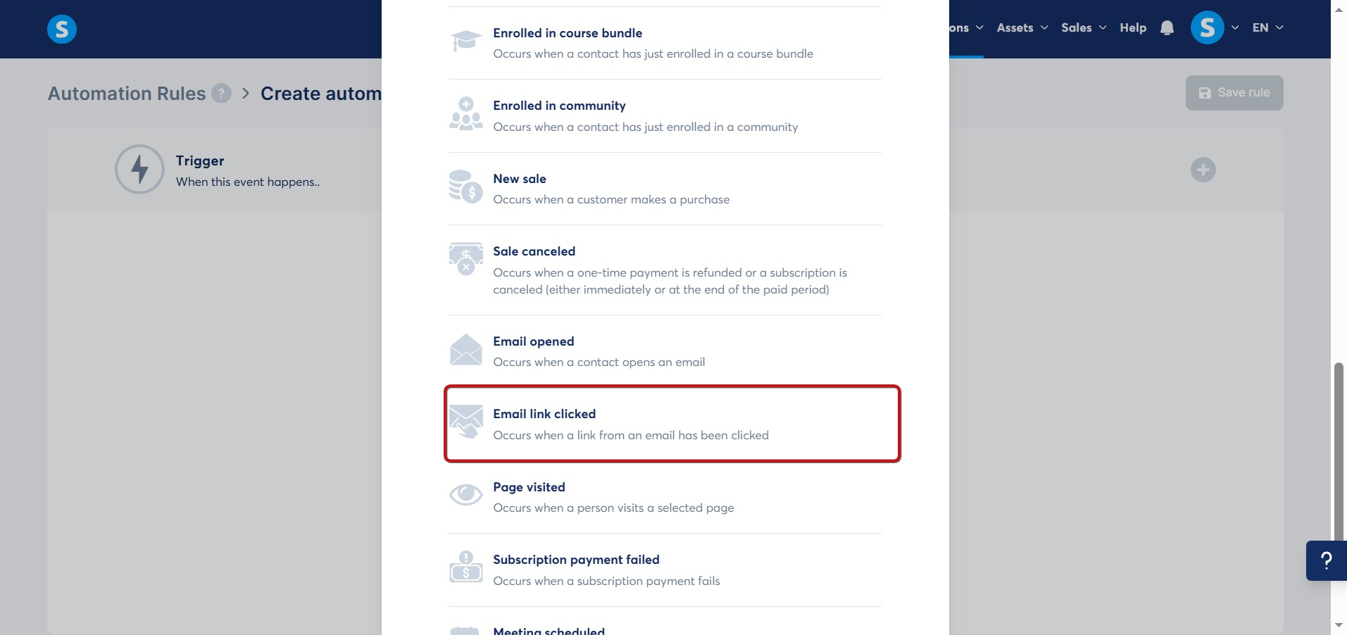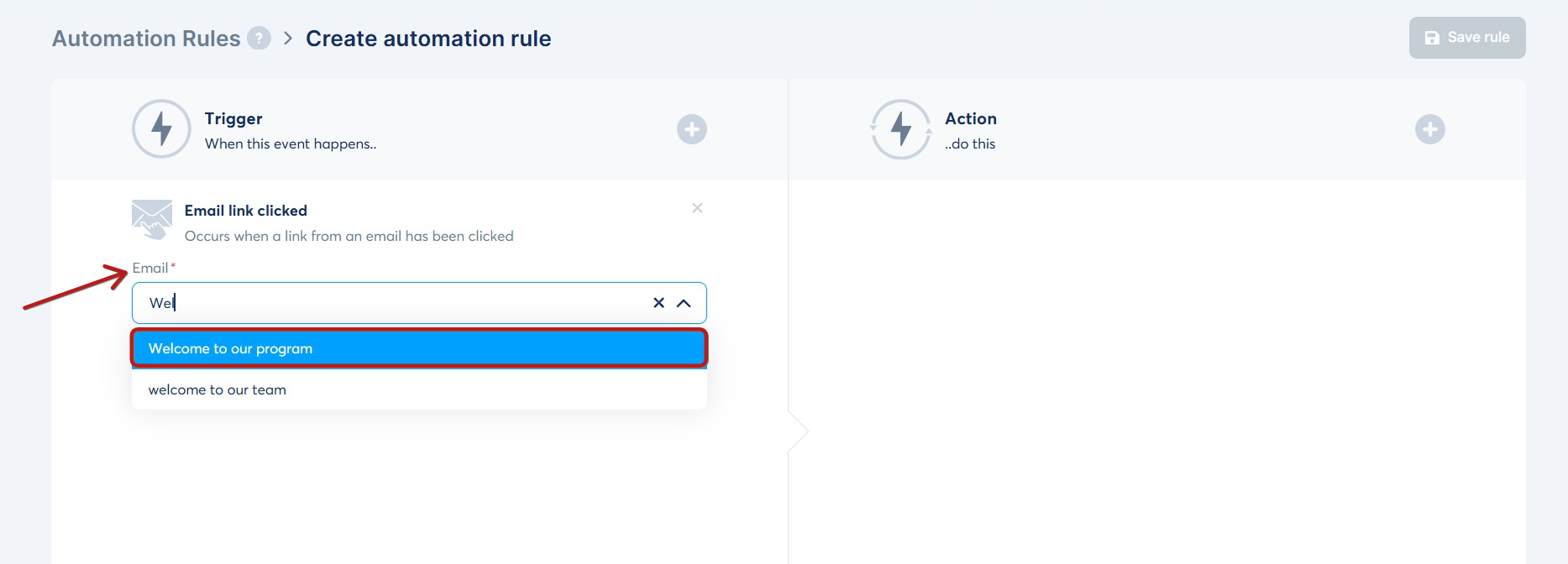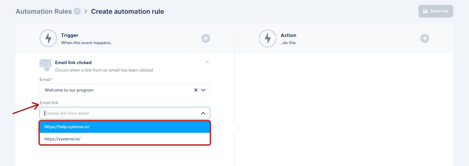 Ardından, bağlantıya tıklandığında gerçekleşmesini istediğiniz eylemi ekleyin. Otomasyon kurallarının nasıl çalıştığını öğrenmek için buraya tıklayın.