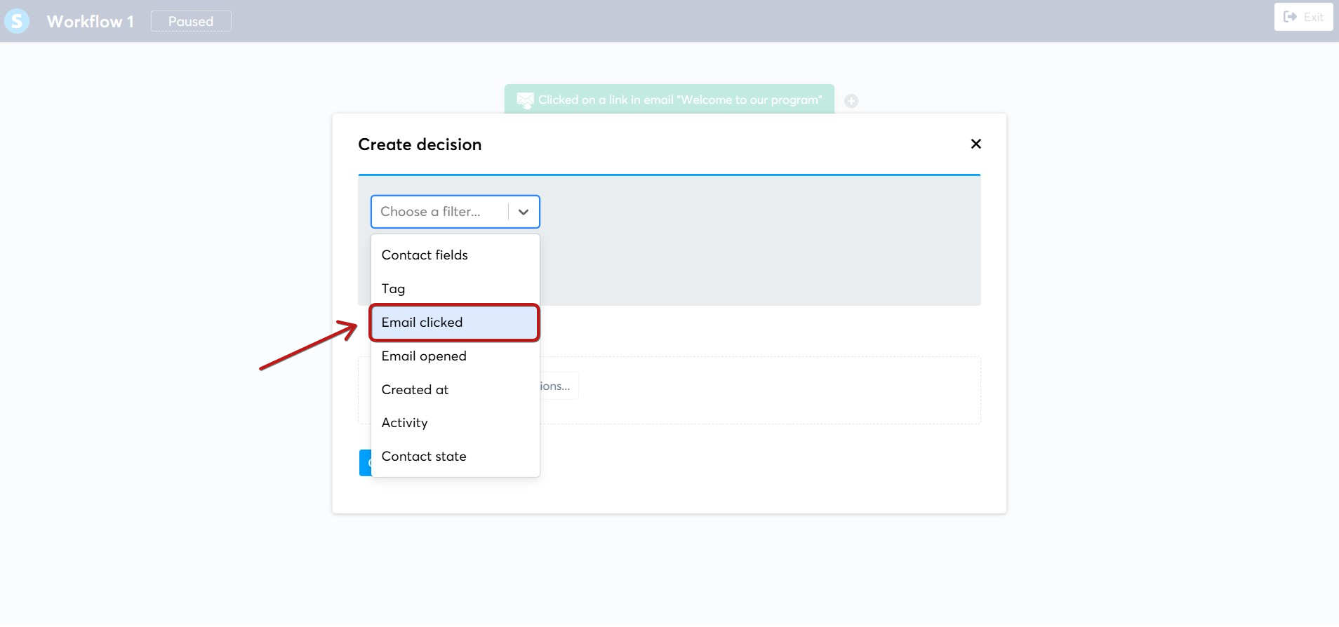 Bir Karar ekleyin ve E-posta tıklandı öğesini seçin.