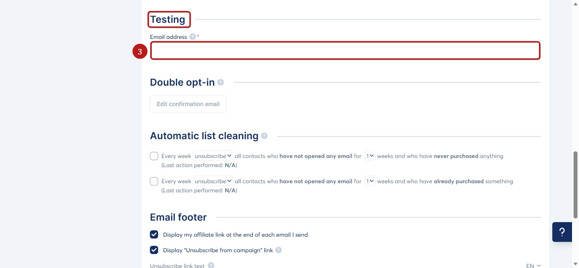 Test bölümüne kaydırın ve test e-postalarınızı almak istediğiniz e-posta adresini girin (3).
