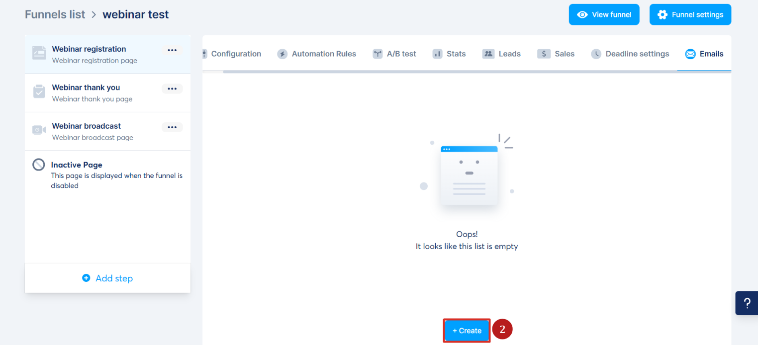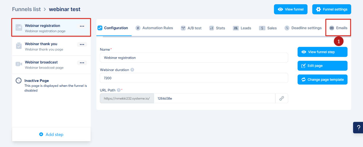 Web semineri kayıt sayfanıza gidin ve E-postalar sekmesine tıklayın (1).