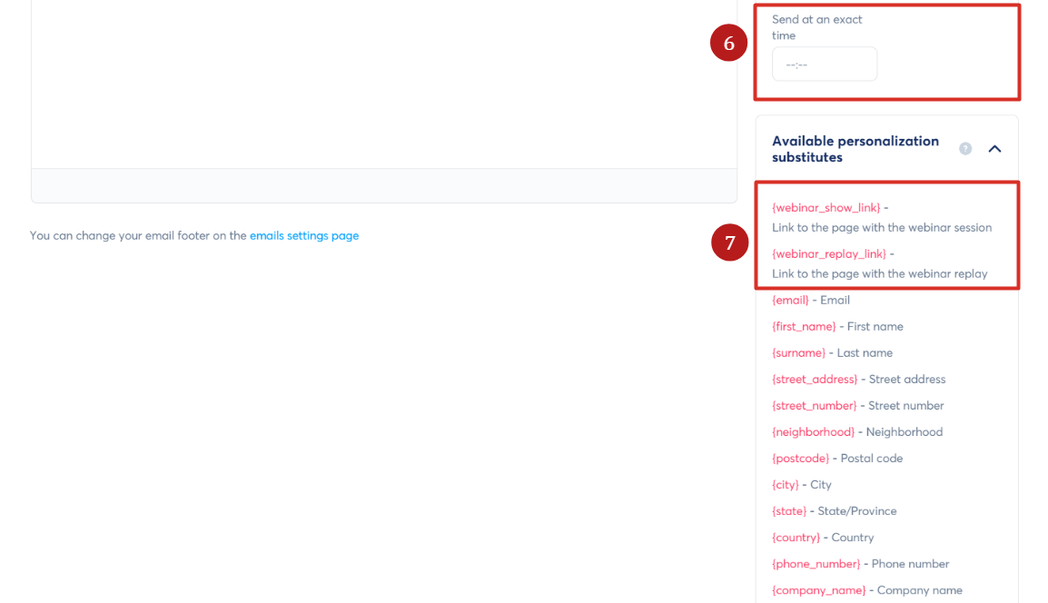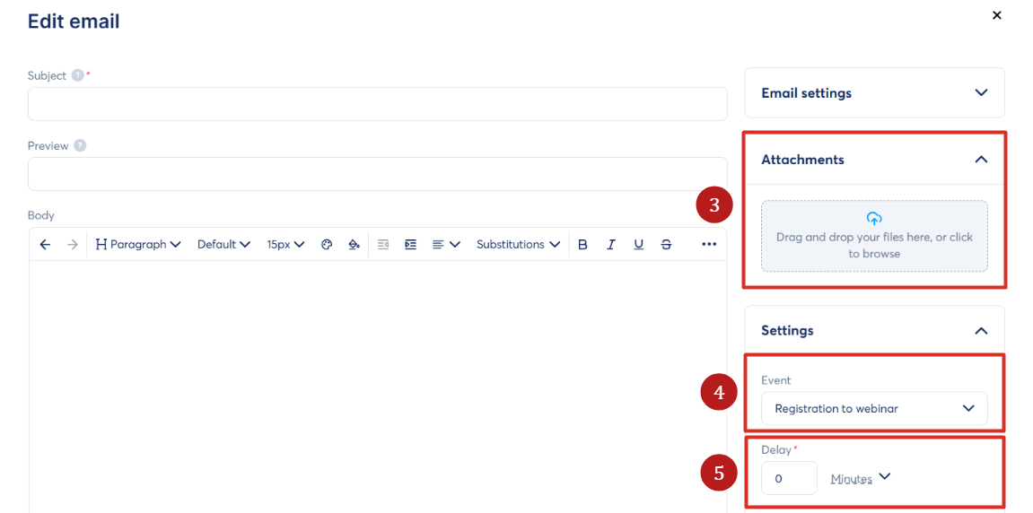 - E-postayı göndermek için bir gecikme ayarlayın (örneğin, webinar başlamadan 15 dakika önce) (5).