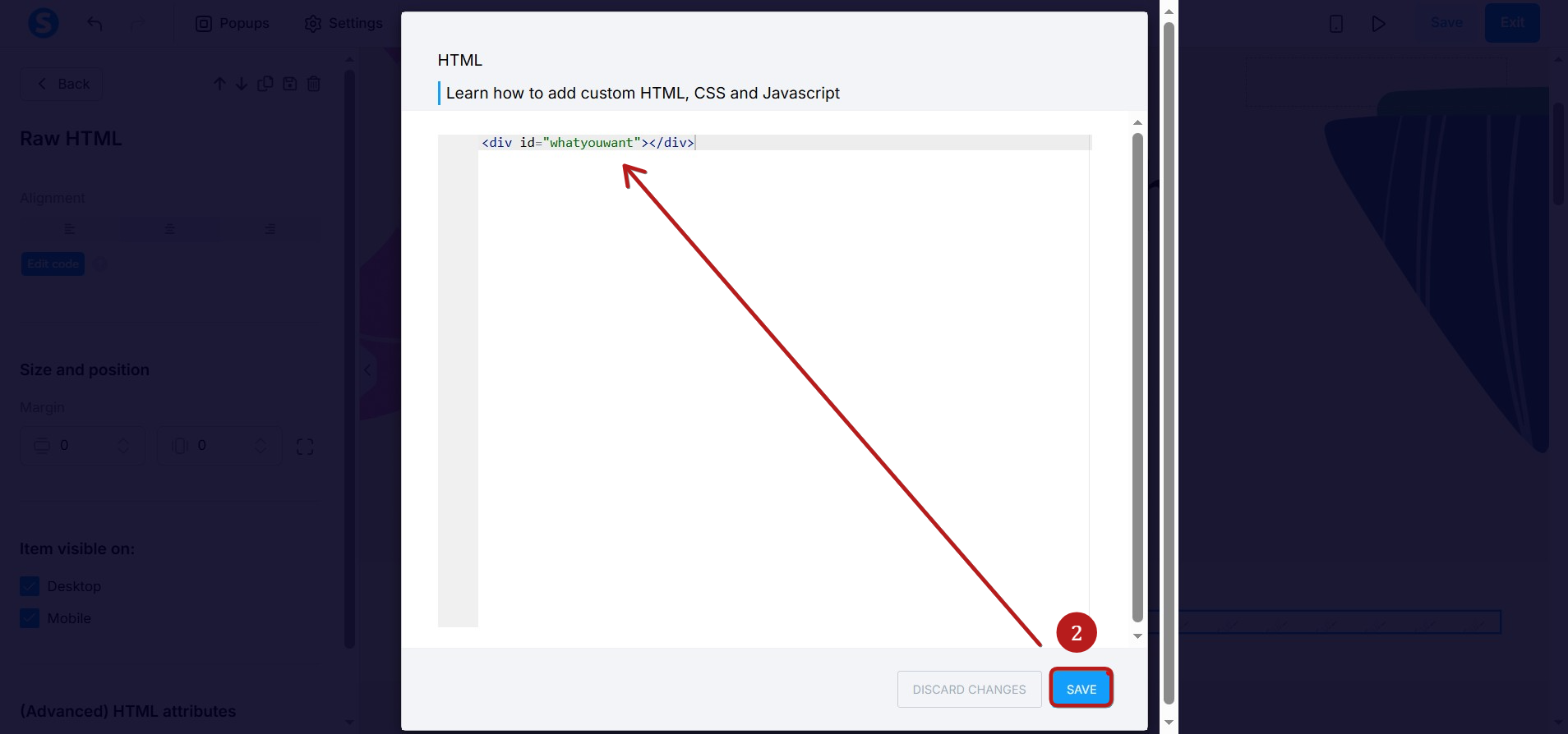 Bu yöntem için, sayfa düzenleyicisine gidin, düğmenin yönlendirmesini istediğiniz konumun hemen üstüne veya altına bir HTML öğesi ekleyin ve HTML'ye <div id="whatyouwant"></div> kodunu girin. (1)