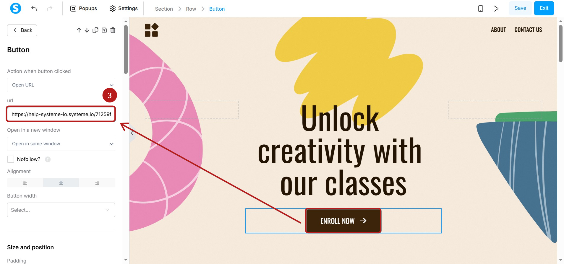 Bağlantı kopyalandıktan sonra, sayfanın üst kısmına bir düğme ekleyin. Düzenleyicinin sol tarafındaki bölmede, URL'yi URL alanına yapıştırın, ardından hemen arkasına #AttributeID, yani #row-88101387 ekleyin(4).