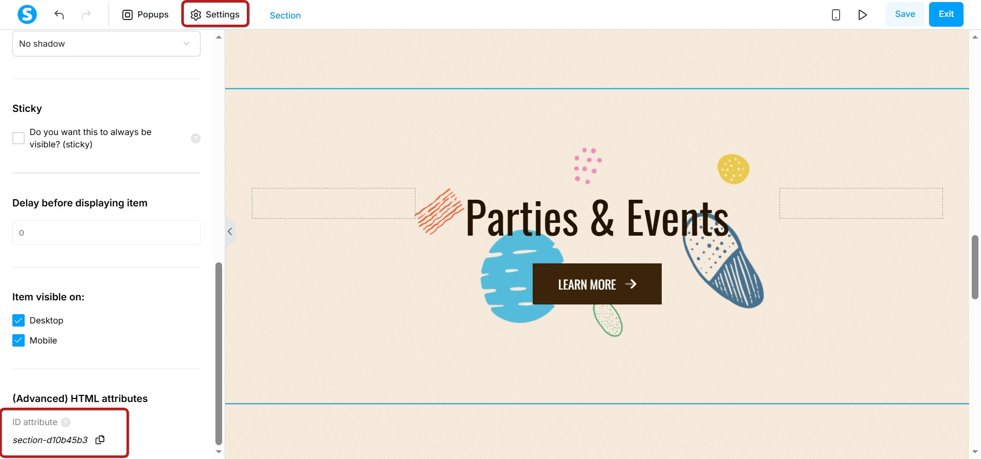 Ayarlarını düzenleyicinin sol bölmesinde görüntülemek için öğeye tıklayın ve ID özelliğini kopyalamak için aşağı kaydırın (yani "section-d10b45b3").