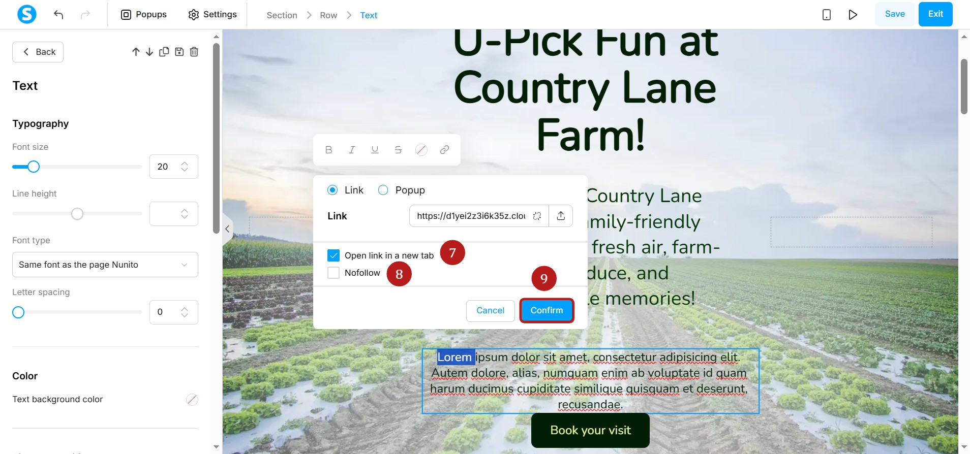 Sayfa düzenleyicisinde, Metin öğesini (1) sayfanıza sürükleyip bırakın.