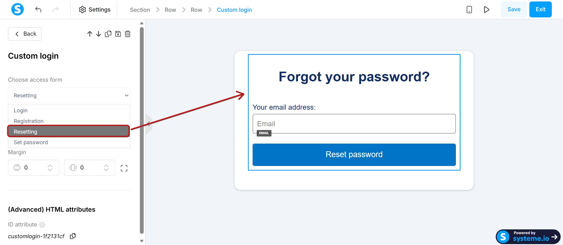 Parola sıfırlama formunu değiştirmek için, Sıfırlama'yı seçin ve sağlanan öğeleri kullanarak formu düzenleyin.