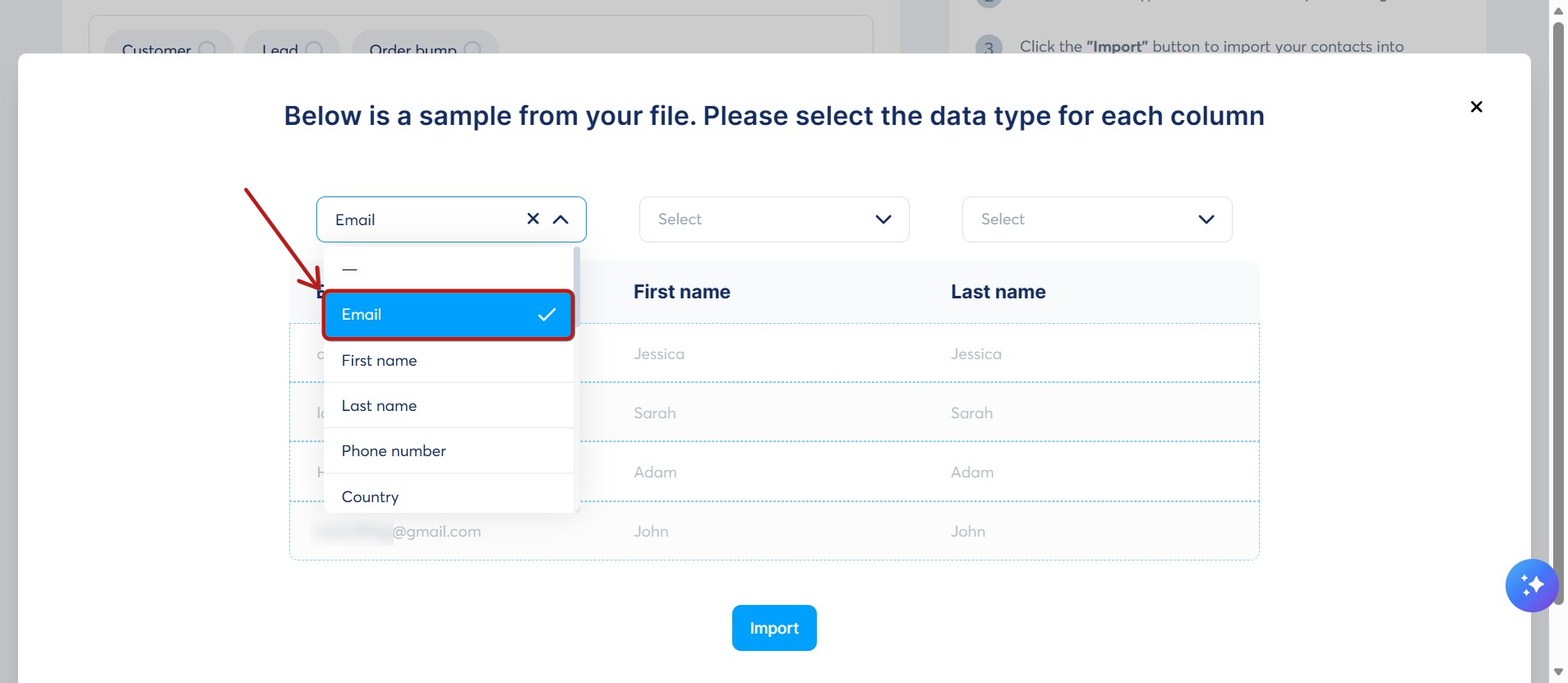 İçe aktarma dosyası, kişinin e-posta adresi alanını içermelidir, bu yüzden E-posta sütununu seçin.