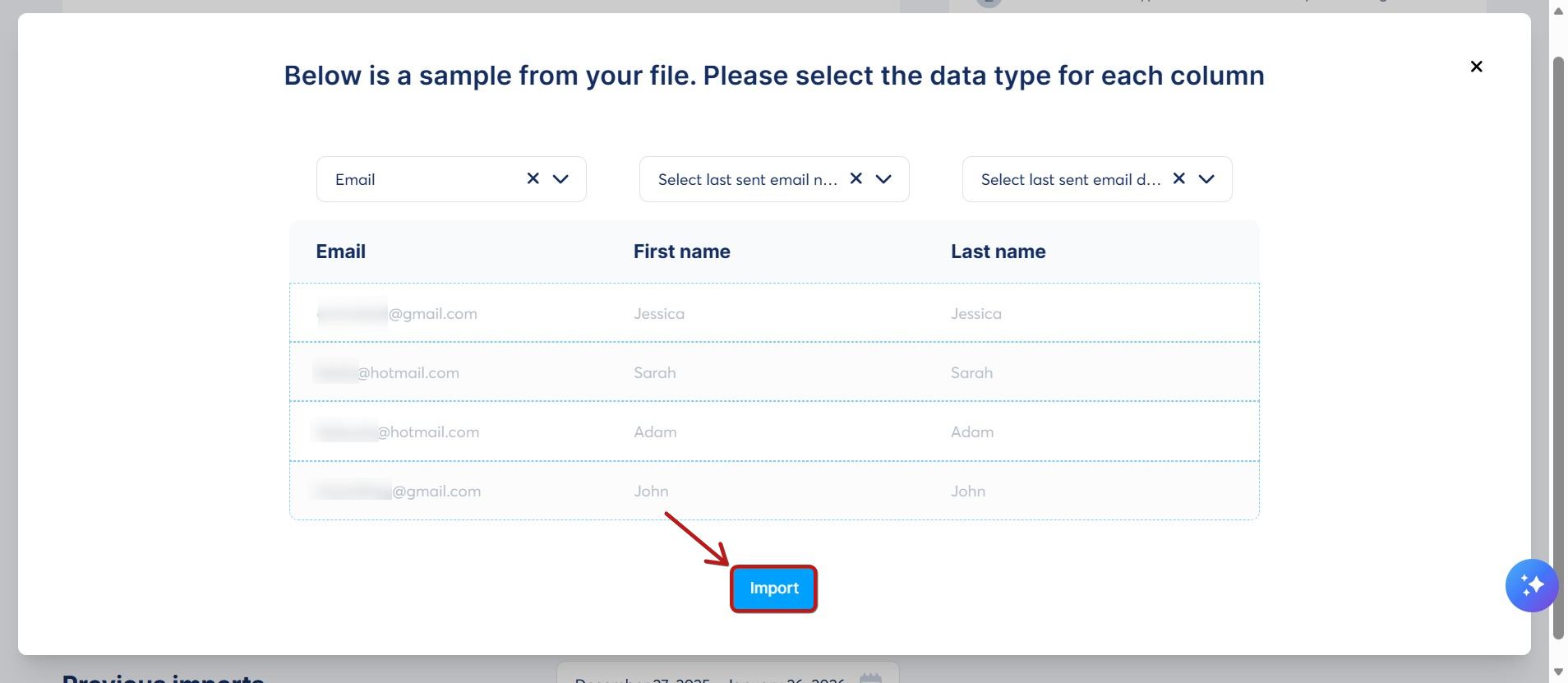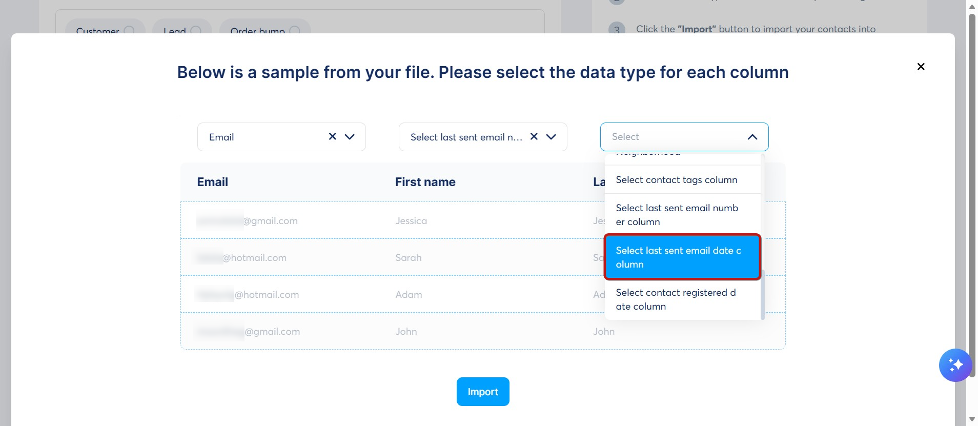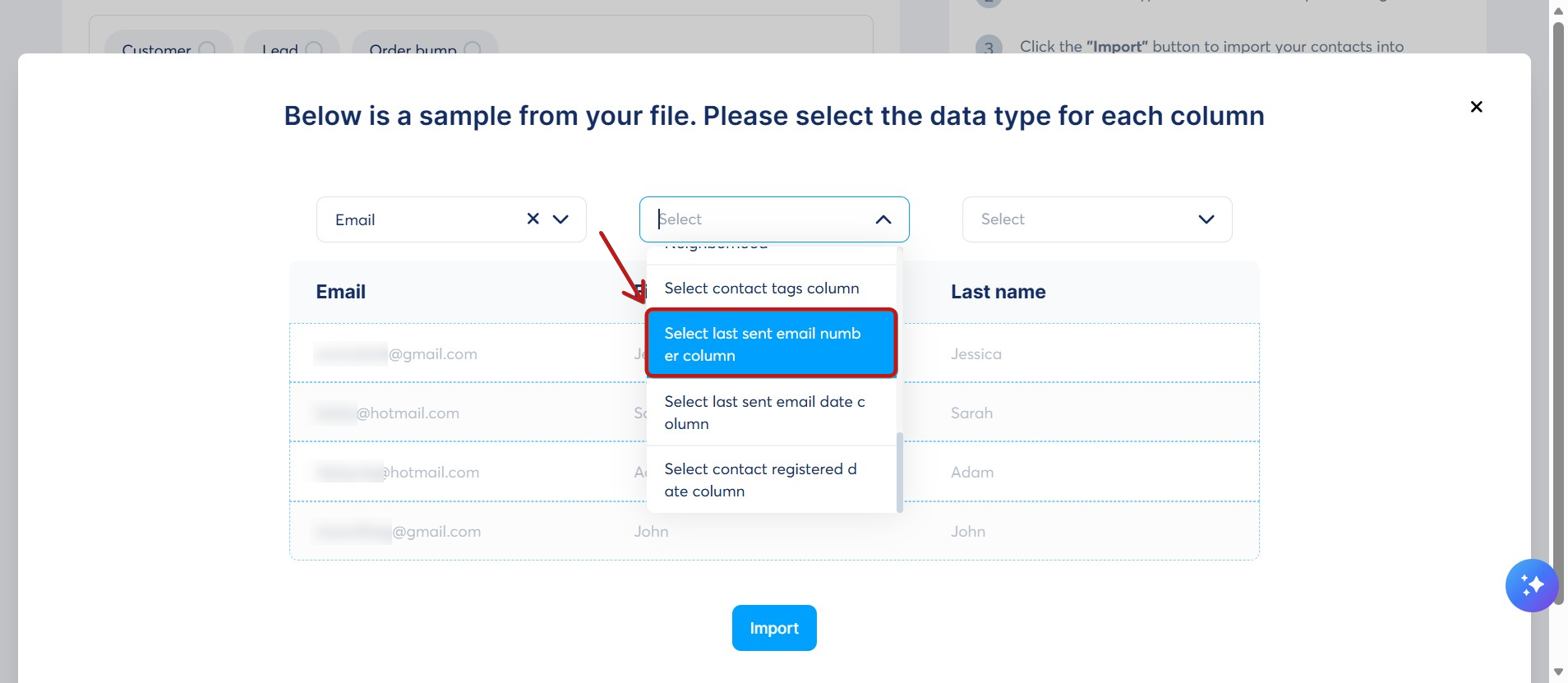 - Taşındığı sistemden gelen, kullanıcının kampanya adımından e-posta aldığı tarih; Son gönderilen e-posta tarihi sütununu seç sütununu seçin.