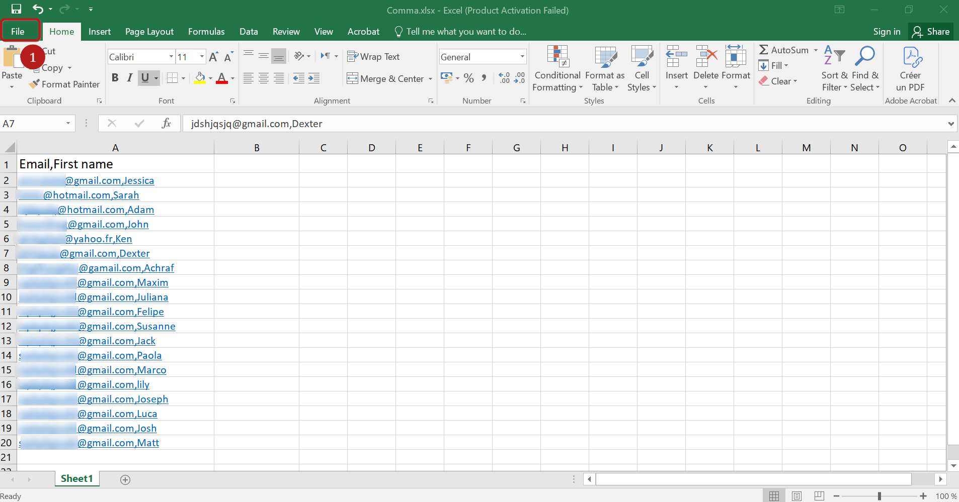 Kişi listesi dosyanızı Excel'de açın ve Dosya sekmesine tıklayın (1).