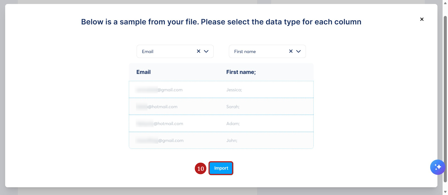 İleri'ye tıkladıktan sonra, her sütunun veri türünü (E-posta, Ad gibi) ve dosyanızdaki diğer ilgili sütunları seçebileceğiniz bir açılır pencere görünecektir.